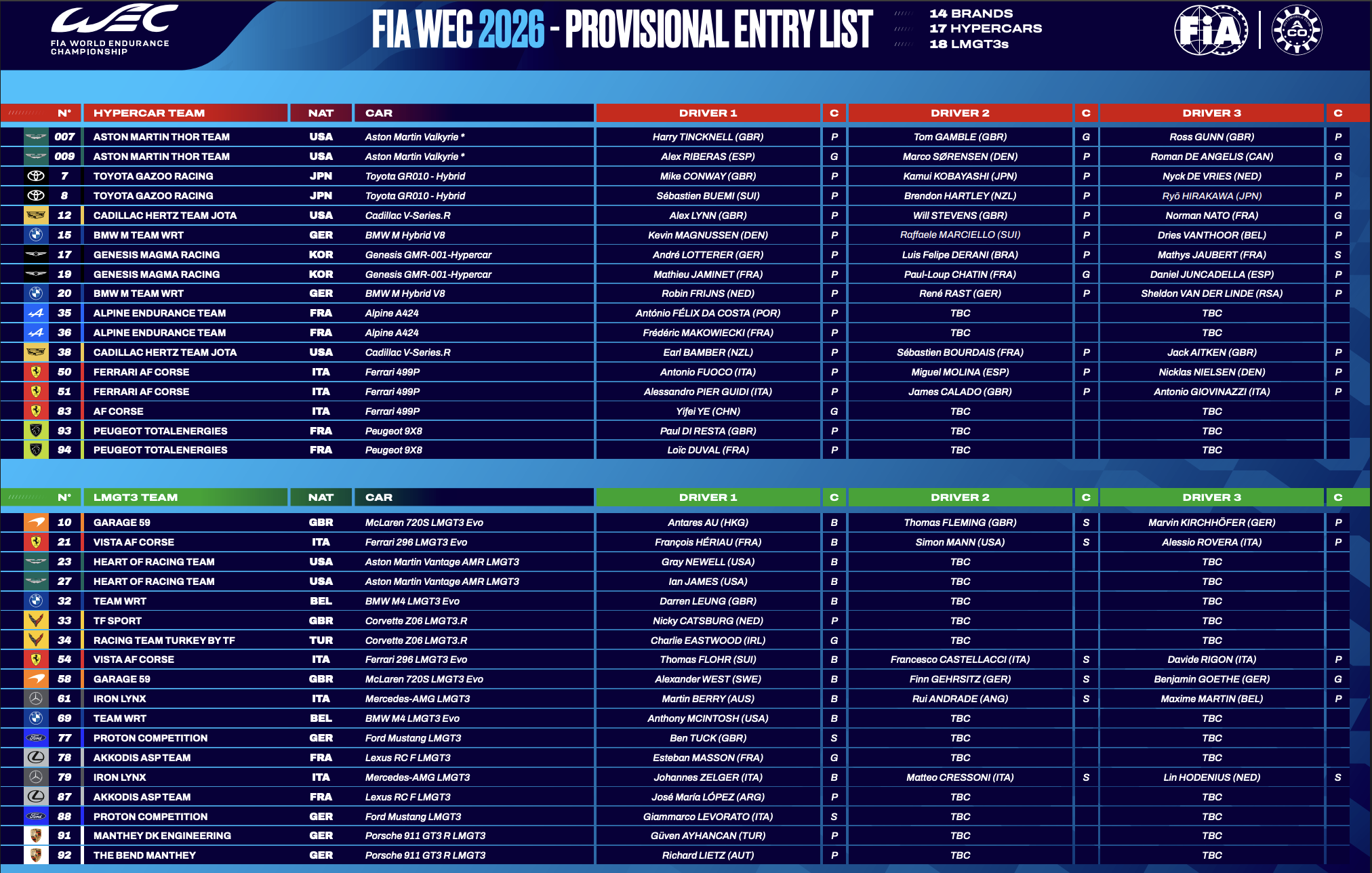 Toyota, Ferrari, BMW and Aston Martin all return with unchanged driver line-ups. AF Corse hasn’t yet formally confirmed Robert Kubica and Phil Hanson on the #83 499P, but that announcement is expected imminently.