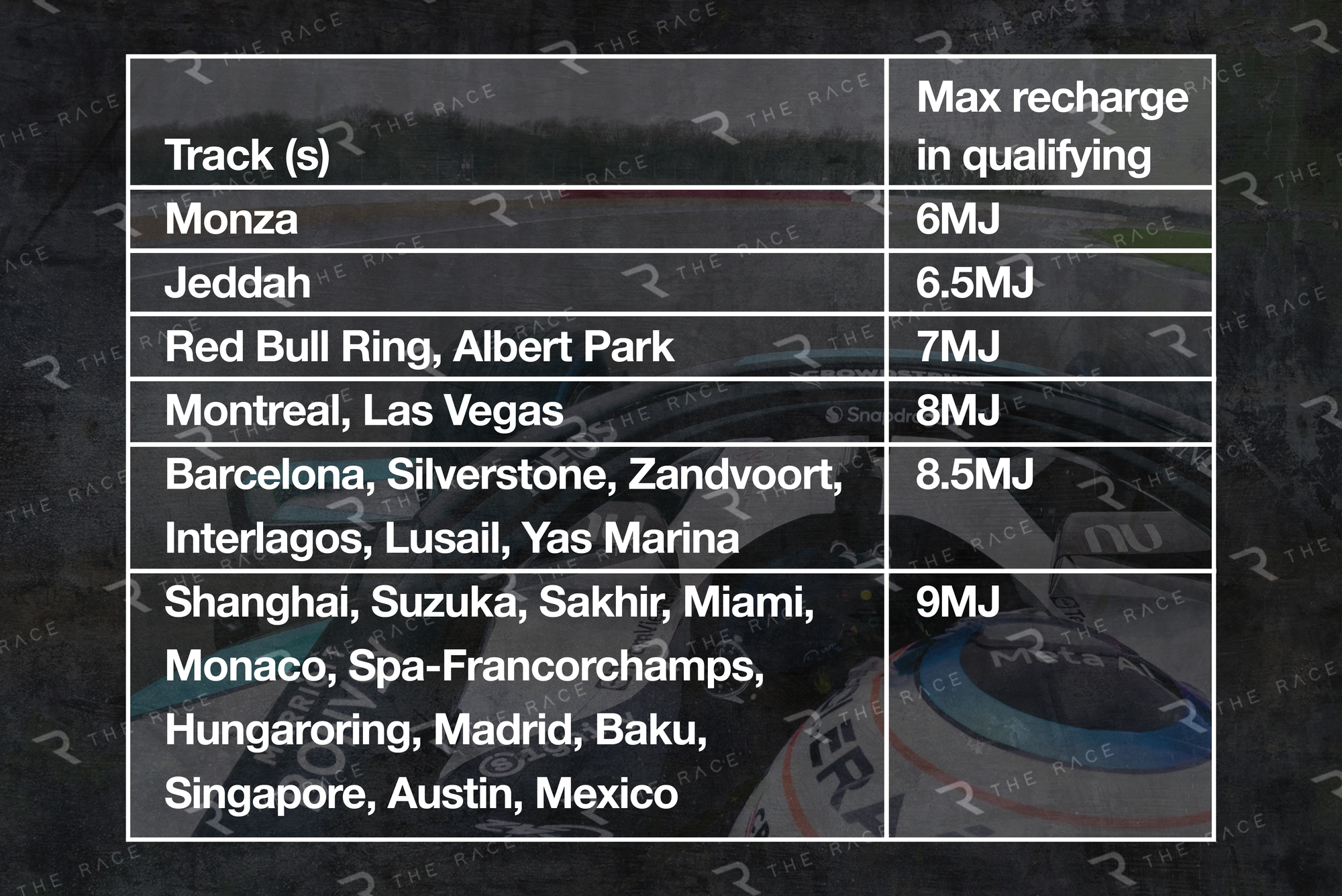 Australia, by contrast, is one of four tracks at the lower end of the scale, with a maximum recharge allowance in qualifying of 7MJ. The Red Bull Ring has the same figure, at Jeddah it is capped at 6.5MJ, and Monza has the lowest allowance of all: just 6.5MJ.