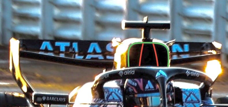 The airbox intake, highlighted in green with the roll bar structure highlighted in red going through it, is again fairly large. The combination of both these two intakes means Williams should have enough cooling capacity for the hottest of circuits.