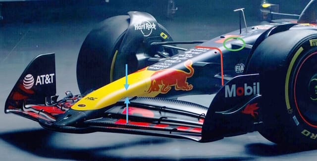 Red Bull has retained the nose-to-front wing forward flap cover panel which means no slot gap. With this middle section of the front wing being the most forward and lowest section, it could produce a small amount of front load at lower speeds.