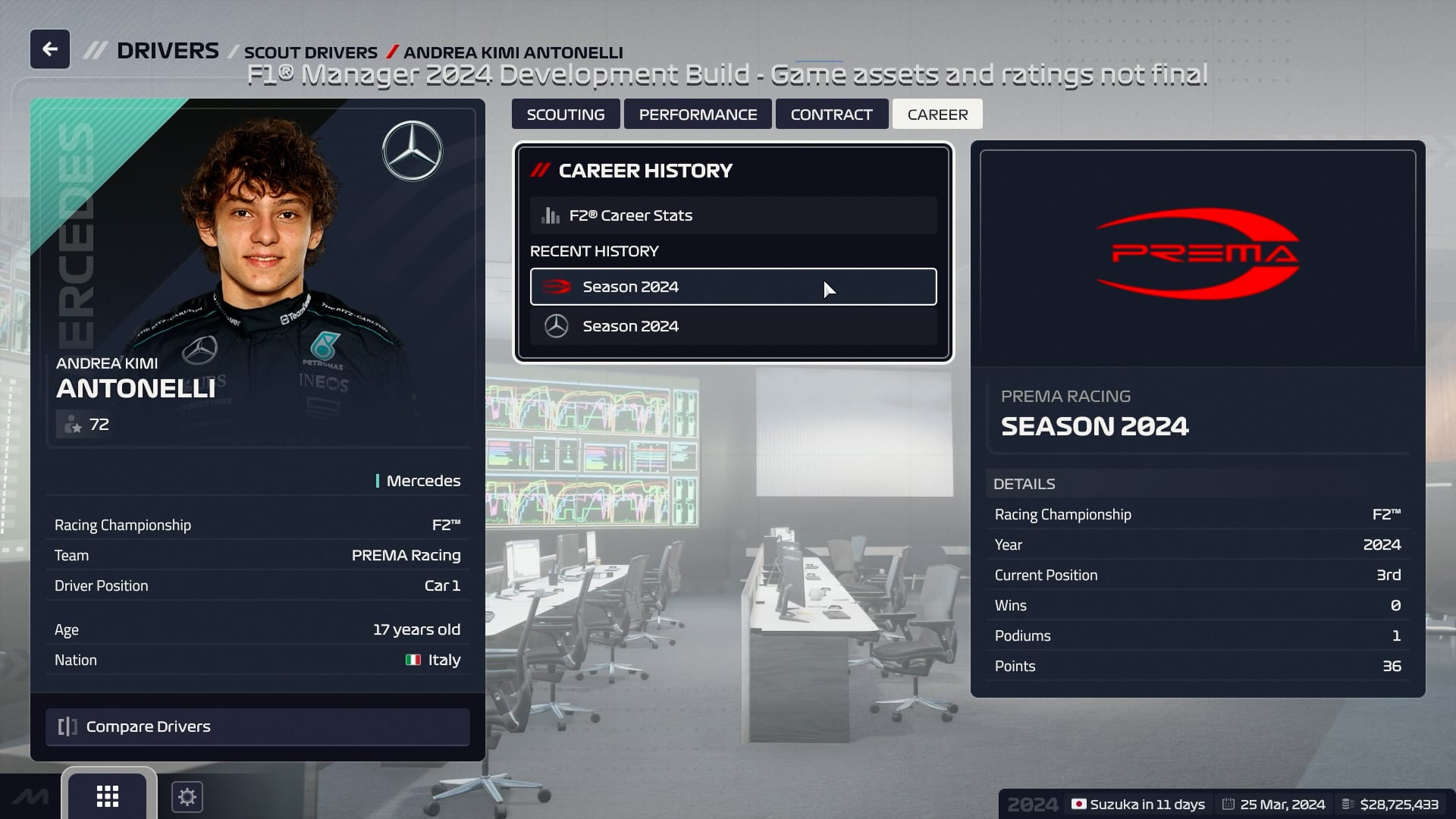 What we were able to get an insight into is the all-new affiliate drivers system, allowing you to essentially create your own driver academy. Any drivers you have as affiliates will seek places in F2 and F3 and can be called up to FP1 sessions.
