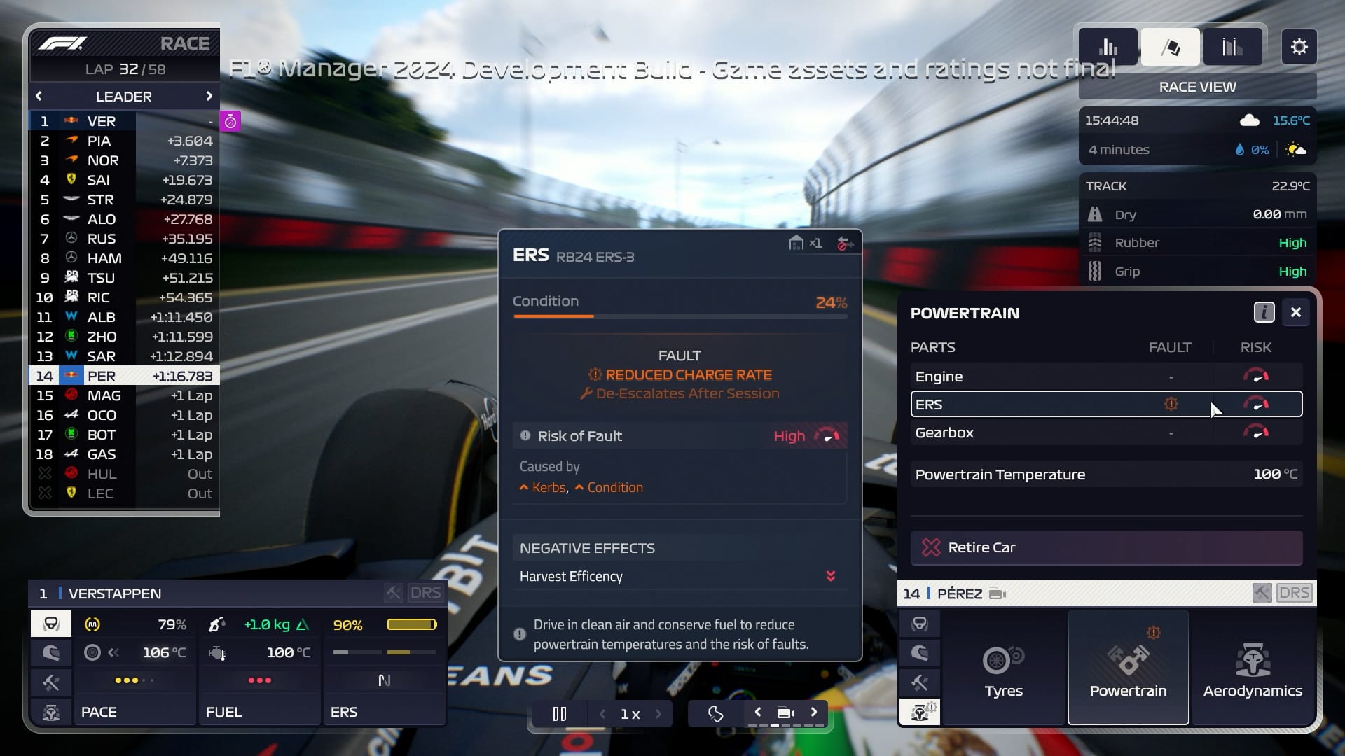 New to F1 Manager 2024 is the inclusion of totally random mechanical faults which range in severity. At one end there are minor, temporary ERS issues that mean your driver won’t have full electrical power deployment for a few laps.