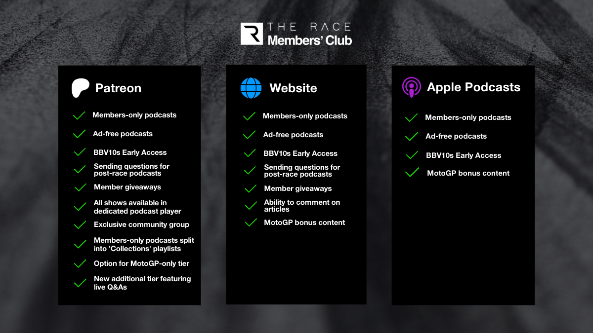 To coincide with this news, we’re also adding MotoGP bonus content to the Members’ Club. And if you only want to enjoy that without any car racing content getting in the way, you can join our bikes-only ‘Riders’ tier on Patreon!