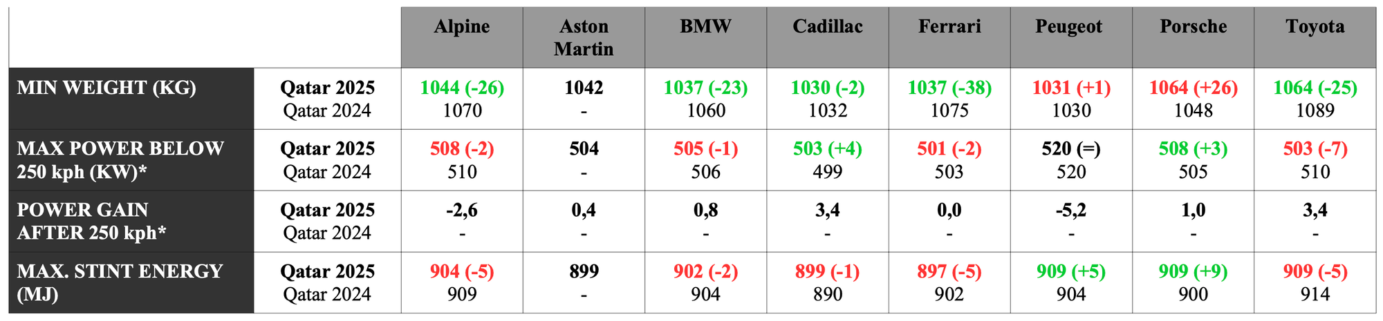And what about Porsche? Having dominated last year, the 963 has been hit hard by BoP adjustments, with a significantly increased weight (+26kg), barely offset by a 3kW power increase.