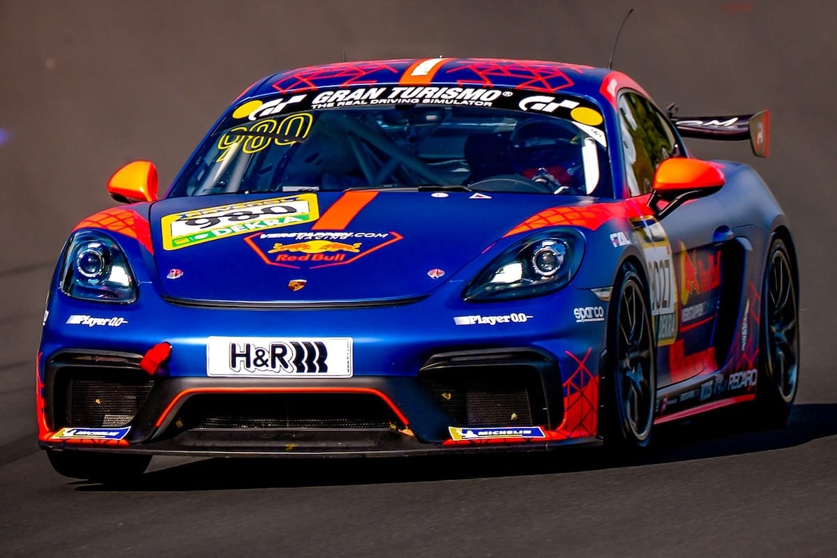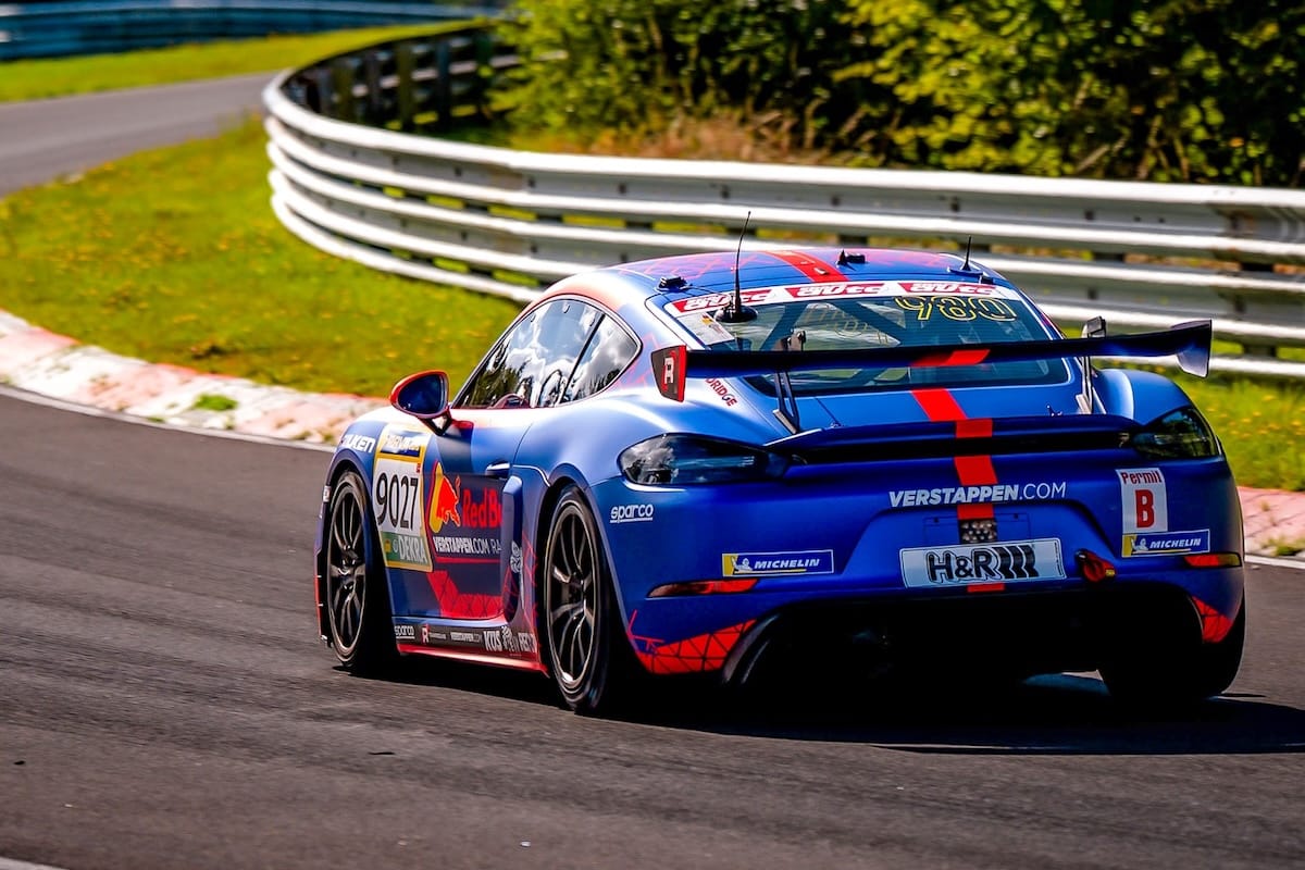 Verstappen started the race behind the wheel of the #980 Porsche 718 Cayman GT4 CS, sporting Verstappen.com colors and, funny enough, carrying a huge ‘Permit B’ sticker on its rear bumper. The car was set to deliver 125bhp less than the standard 718 Cayman as it is driven by rookies. With its engine restricted to 300bhp, Verstappen had no chance of defending at the start against his rivals, despite having outclassed them in qualifying earlier that morning.