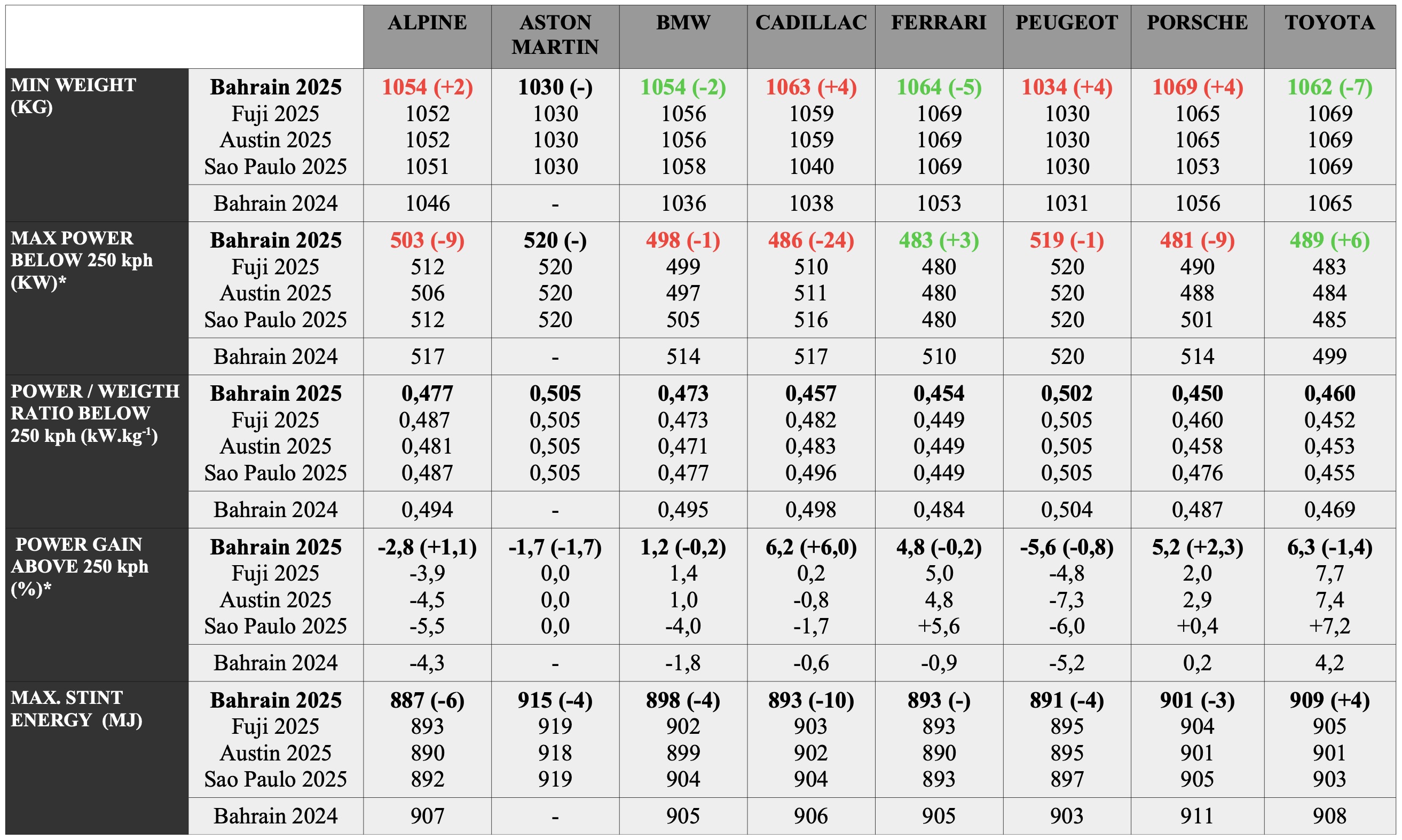 The biggest change since Fuji comes for Cadillac, which loses 24kW (32bhp) and gains 4kg. Porsche also suffers a drop in its power-to-weight ratio compared to Japan, whereas Ferrari and Toyota see slight improvements.