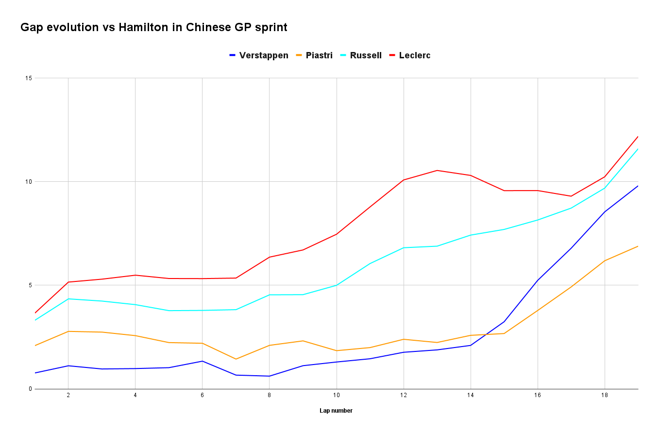Even once Piastri cleared Verstappen, the McLaren driver was unable to make inroads - and actually fell from 2.6s behind once he got into second, to 6.9s behind at the flag, losing a second a lap to Hamilton in the closing stages.