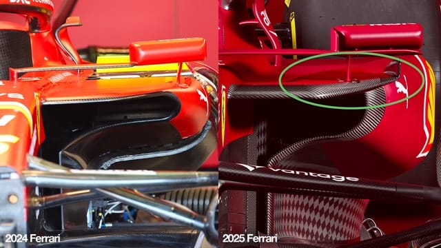 Ferrari has extended the gully section on the top surface of the sidepods (green highlight above), which now gives the car an outer raised section that is not dissimilar to the 2022 version.