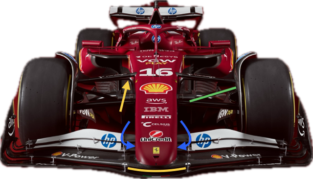 To help clean up that area it has also integrated the front trackrod (green highlight on the 2024 car above). It is probably within the forward leg of the lower wishbone.