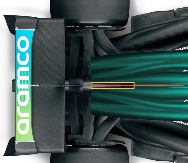 To increase the cooling exit area Aston has a trailing edge slot on the centre line of the engine cover and a fin in the middle of it, the regulations define the side view that you are required to have and this fin is to legalise this slot feature.