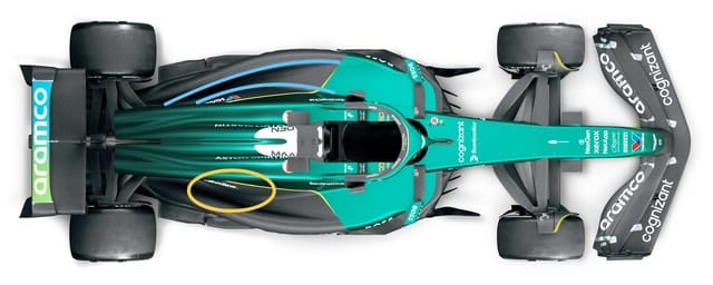 I have highlighted the fin in red and the cutout in yellow, it’s not a big exit area but it allows some of the hot air that has gone through whatever cooling is mounted high up to not interfere with the main sidepod cooling.