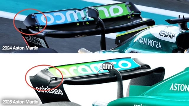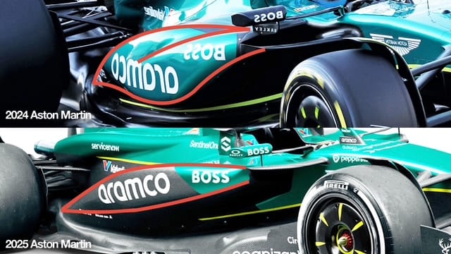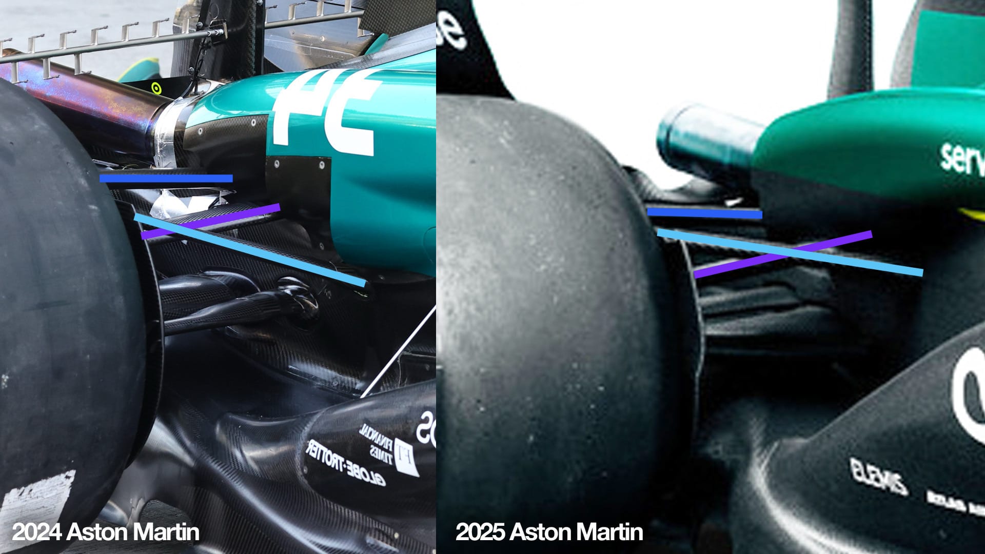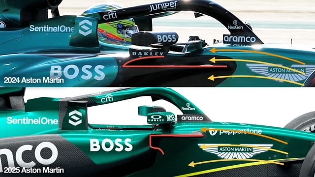 The radiator intake in comparison to the 2024 car has now got the Peaky Blinders hat brim' top surface over the inlet, most teams went to this solution to some degree last year but Aston Martin stuck with the older 'duck bill' style.
