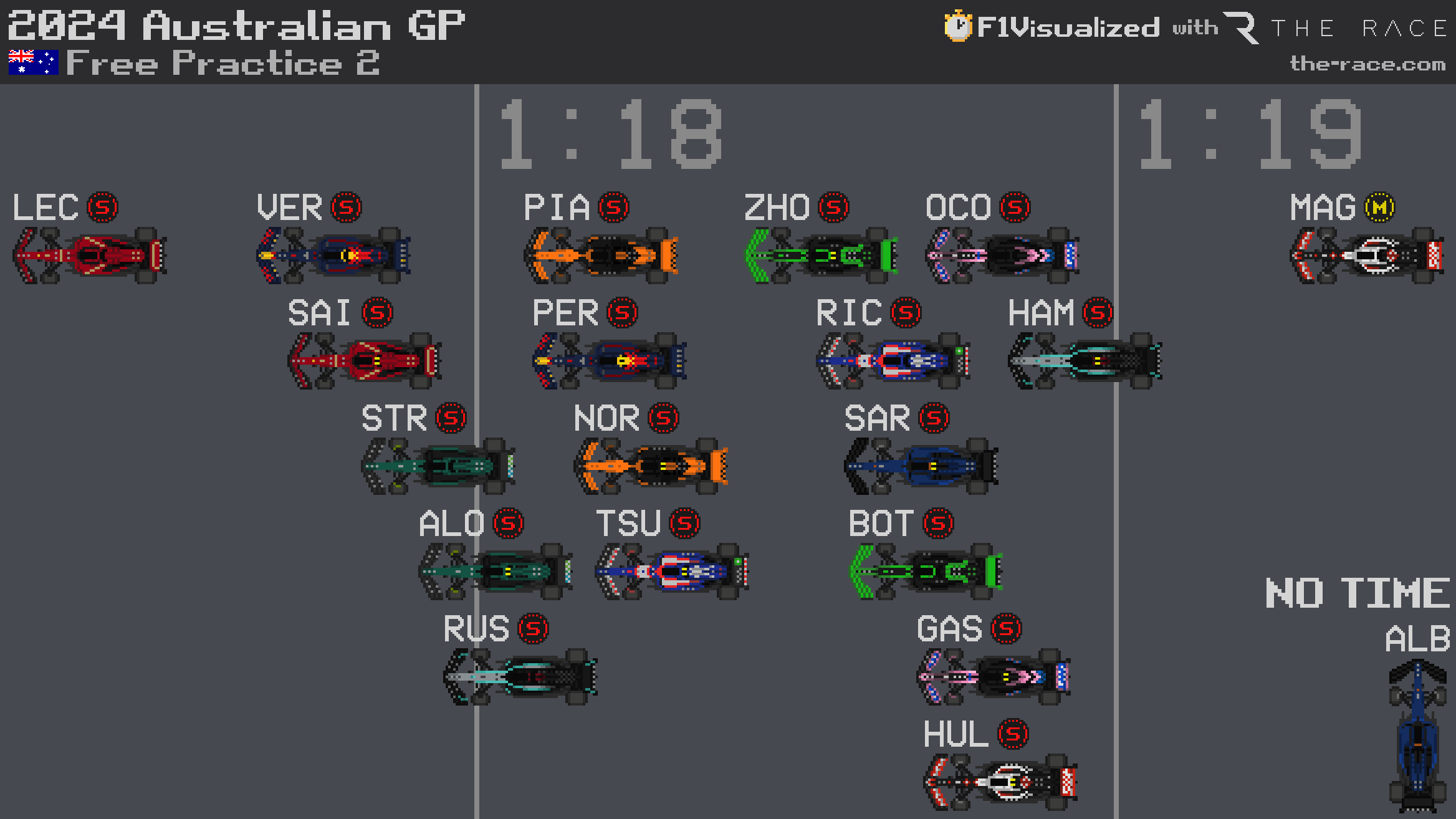 Only 19 cars ran as Williams worked to repair Alex Albon's car following his heavy practice one crash. It does not have a spare chassis with it in Melbourne.