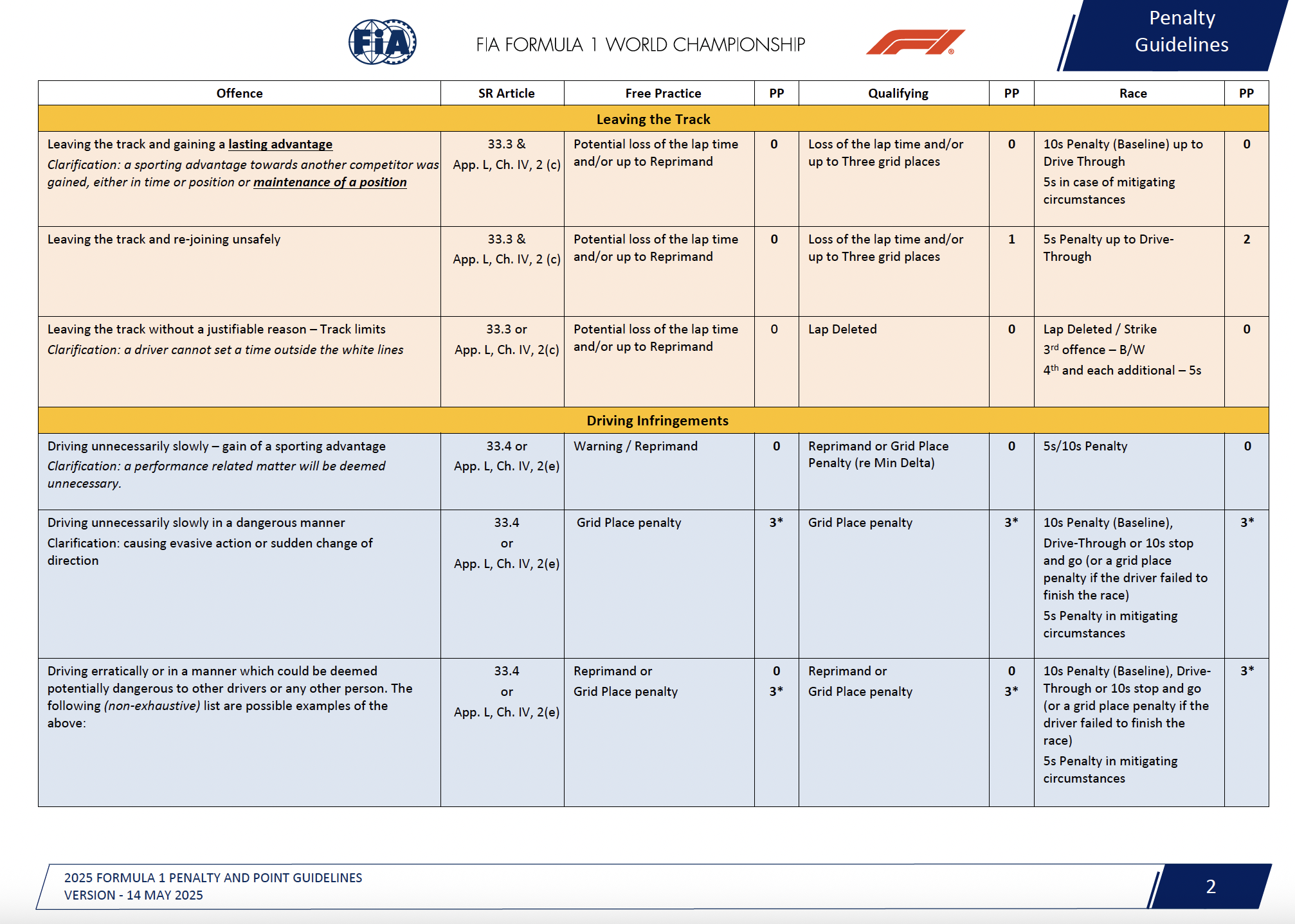 However, the actual FIA document has highlighted how detailed what is in effect a ‘menu’ system is – with all potential rules breaches covered, and guidance offered for how severe penalties should be for practice, qualifying and races.