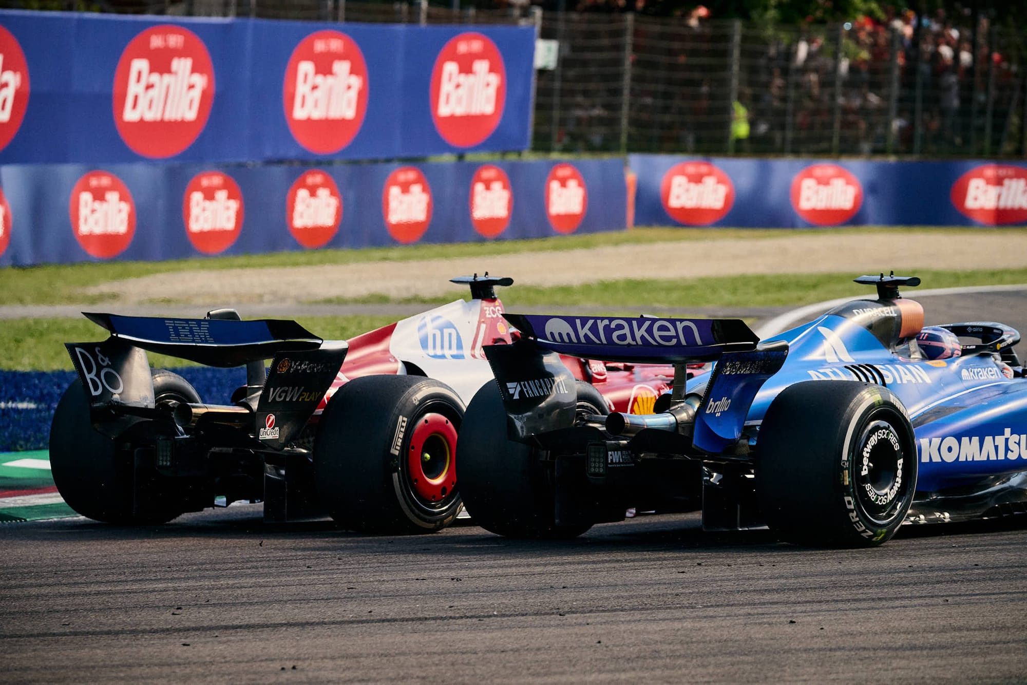 Albon, on fresher tyres at the time, had attempted to go around the outside of the Ferrari at the first left-hander – but found himself squeezed out on the exit and had to skip across the gravel to avoid a collision.