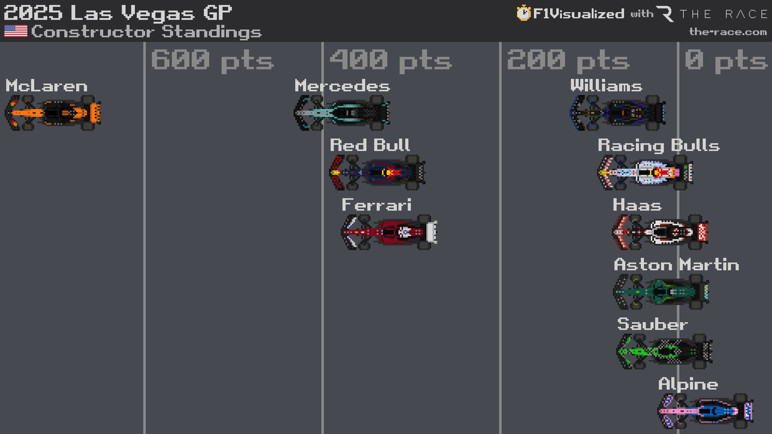 Behind, the battle for sixth swung more emphatically towards Racing Bulls in Vegas too. In fact, even though the double disqualification of the McLarens elevated both Haas drivers into the points - when the team was originally set to score nothing - actually helped Racing Bulls more.
