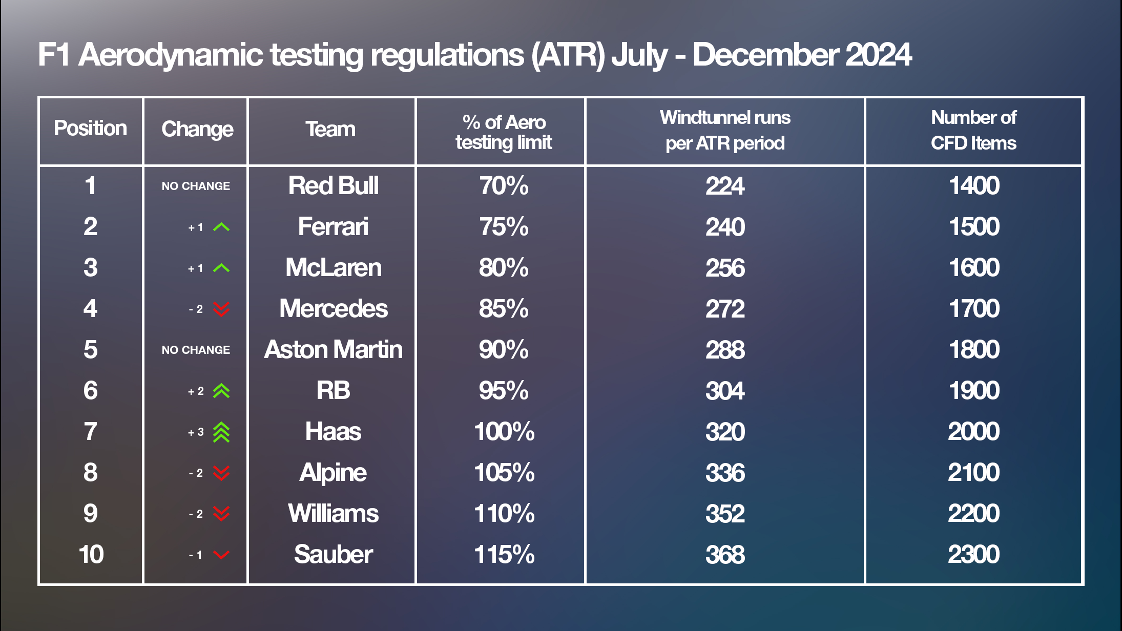 The 2023 constructors’ championship standings meant Red Bull had the lowest allowance and Haas the most. The final order was: Red Bull, Mercedes, Ferrari, McLaren, Aston Martin, Alpine, Williams, AlphaTauri (now RB), Sauber and Haas.