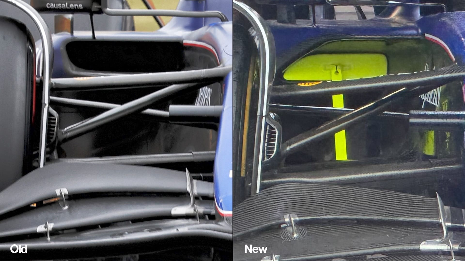 The sidepod inlet is new, with an enhanced upper lip, claimed to improve aero losses from the front of the car and thus powering up the airflow downstream.