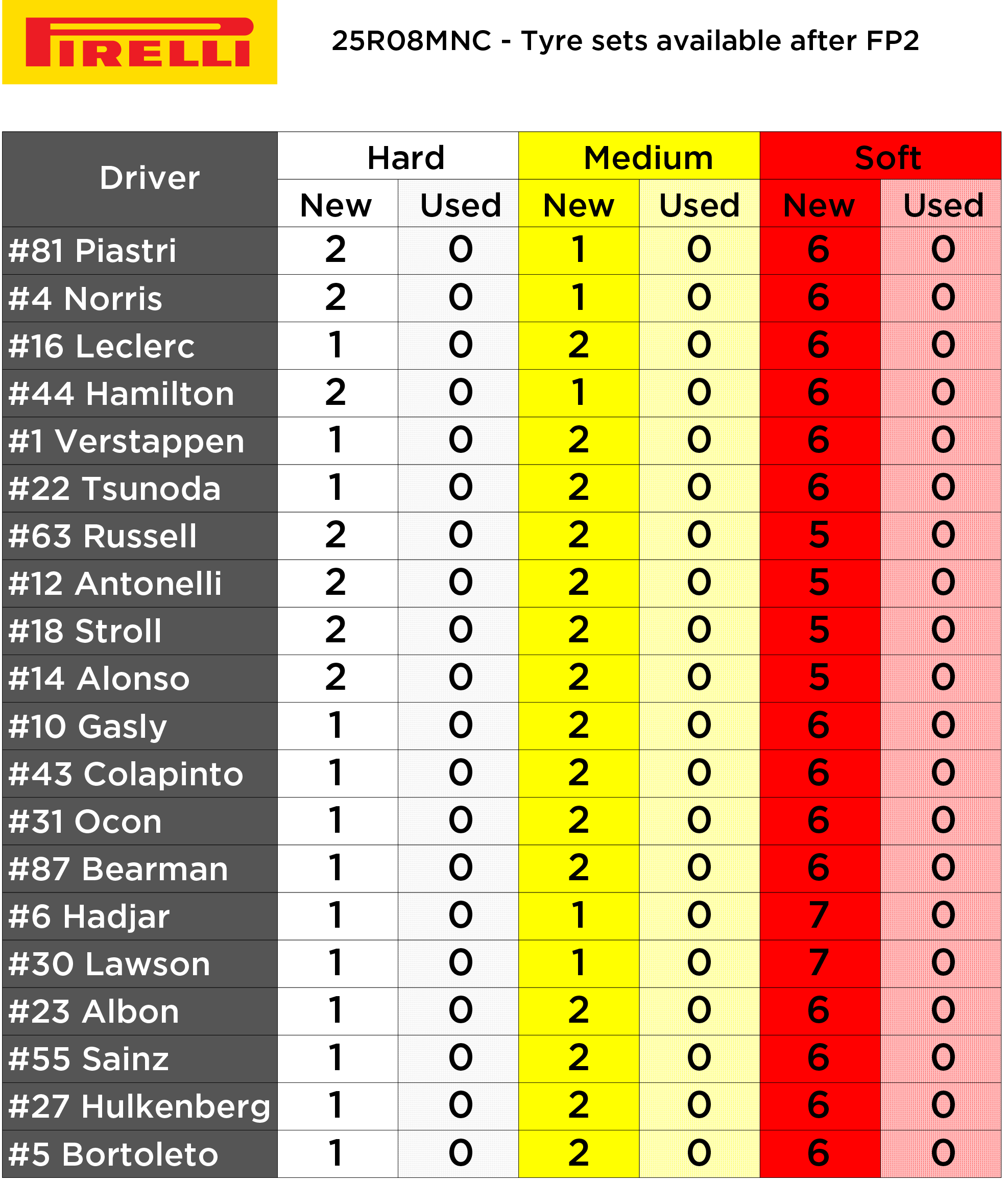 Those drivers who ran two sets of mediums in Friday practice so only have one fresh set left are Oscar Piastri, Lando Norris, Lewis Hamilton, Isack Hadjar and Liam Lawson.