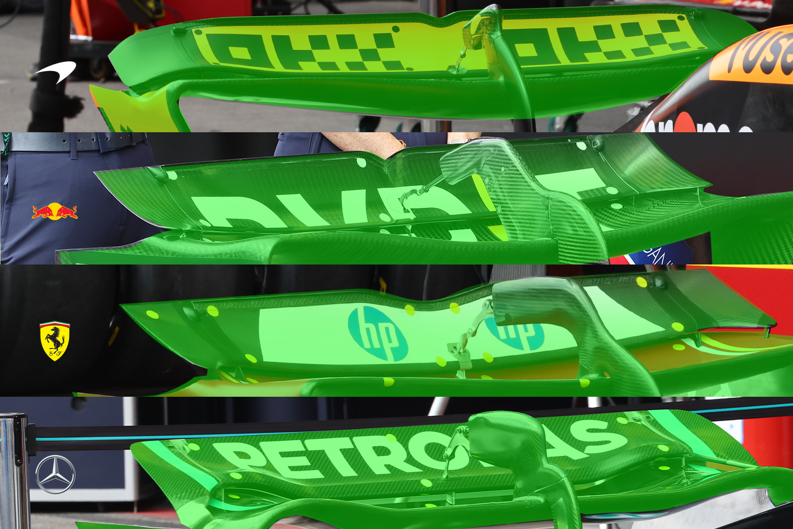 McLaren introduced a new family of rear wings “upgraded around some more modern concepts” at this year’s Belgian Grand Prix, where video footage seems to show similar deformation.