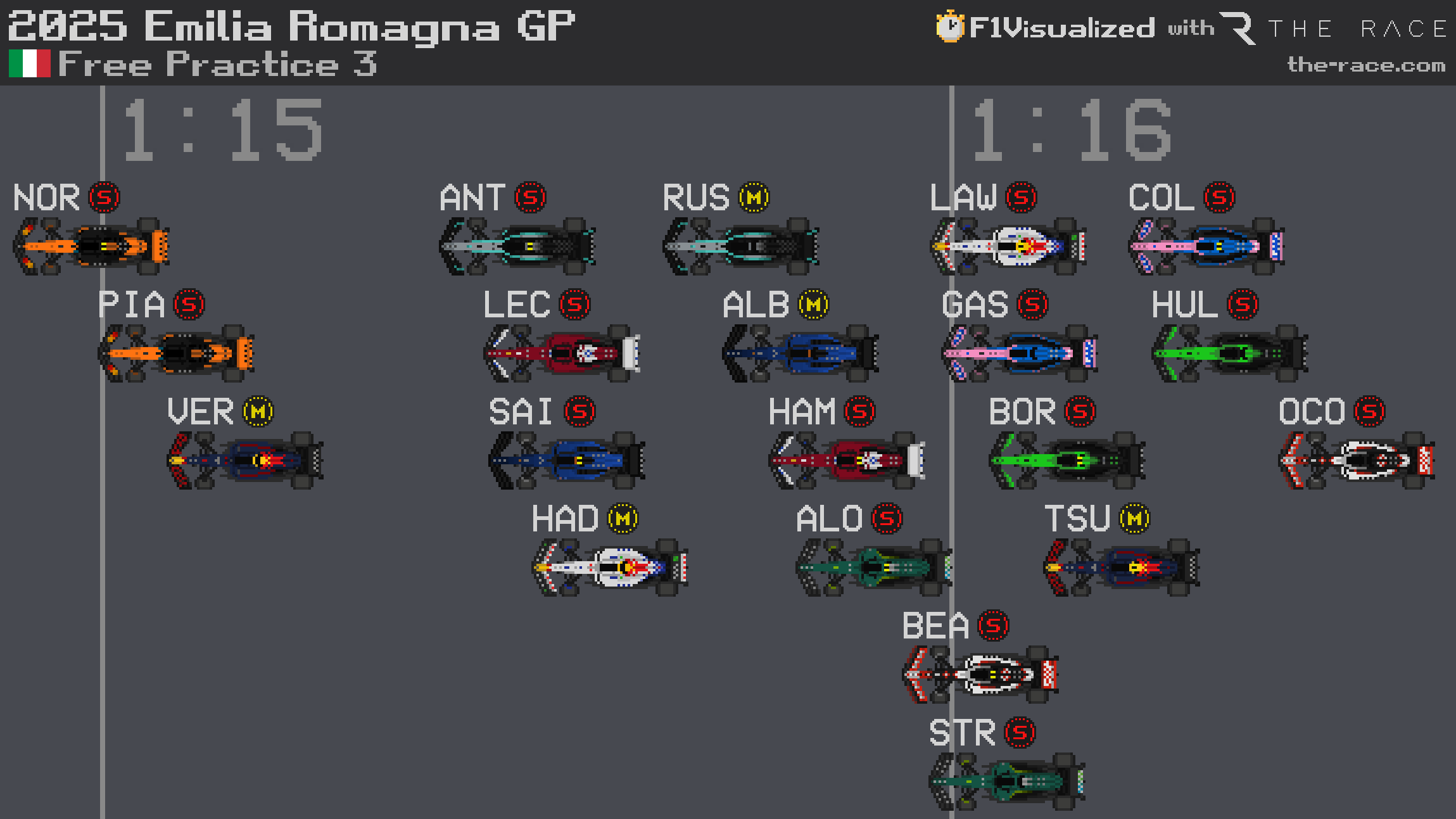 Slotting in between them was the lead Ferrari (Charles Leclerc), the lead Williams (Carlos Sainz) and the lead Racing Bulls (Isack Hadjar).