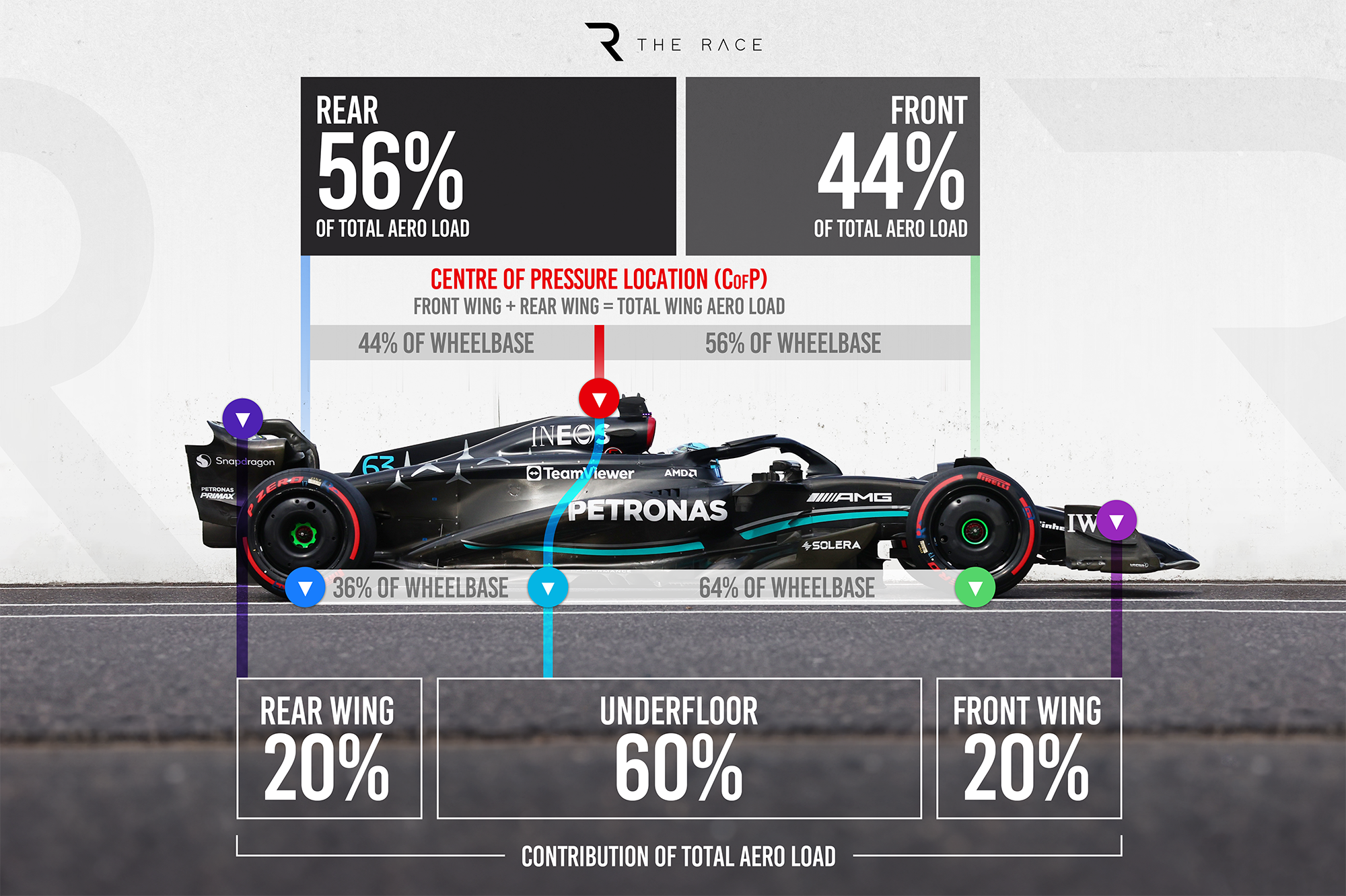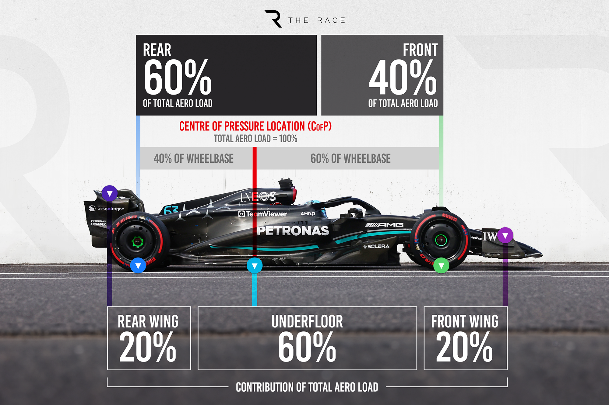 This shows that the front and rear wing centre of pressure and the underfloor centre of pressure are all adding up to this single balance location with the aero load distributed at 40% on the front axle and 60% on the rear axle. This is what is called the Centre of Pressure (or CofP=40%F).
