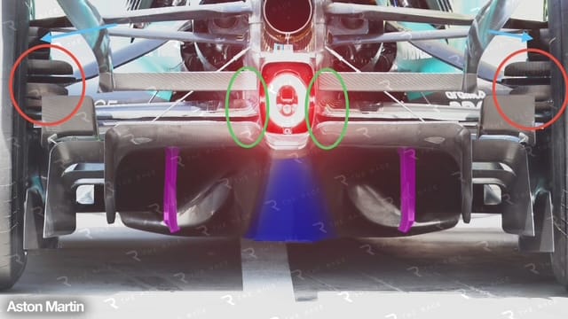 Adrian Newey's Aston Martin has the brake-duct-mounted vanes (red ellipse) and a hot air exit from the brake ducts that's smaller than most. There's also nothing on that inner area of the diffuser-to-rear-crash-structure so what we are seeing in this area is fairly basic.