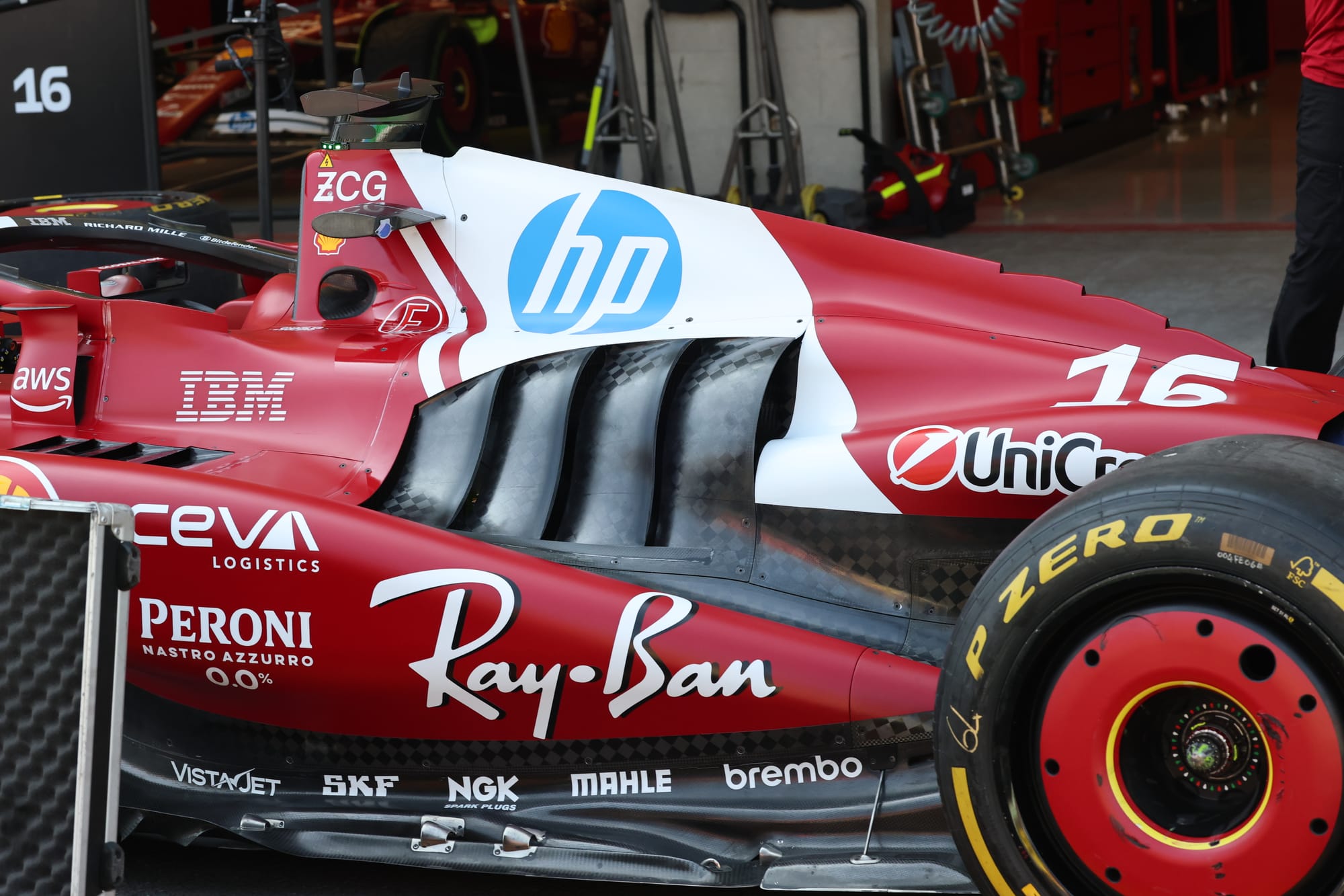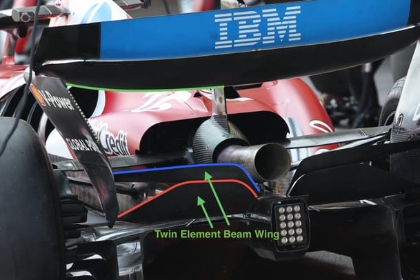 Ferrari is also using a two-element beam wing. As with the Red Bull version, I have highlighted the trailing edge of the lower element with a red line and the trailing edge of the upper element with a blue line.