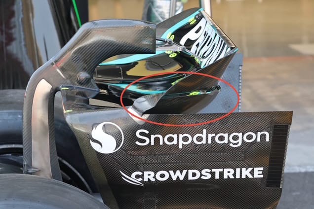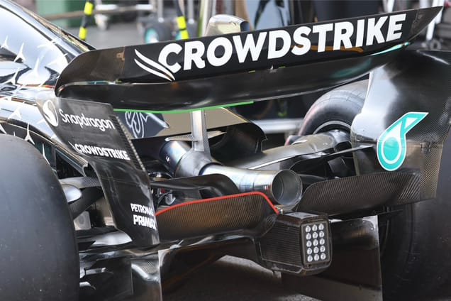 Mercedes has a brutal beam wing that effectively continues across the width of the trailing edge of the diffuser (highlighted in red). It also uses most of the allowable upper wing cross-section (green highlight).