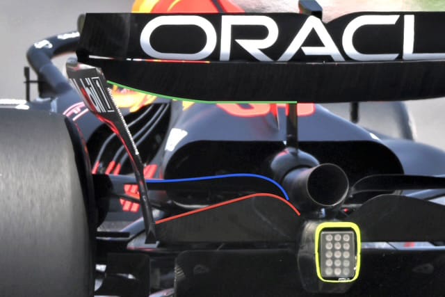 Red Bull is a little bit different in that it has gone for a twin-element beam wing. The lower element trailing edge is highlighted with a red line and the upper element trailing edge highlighted with the blue line.