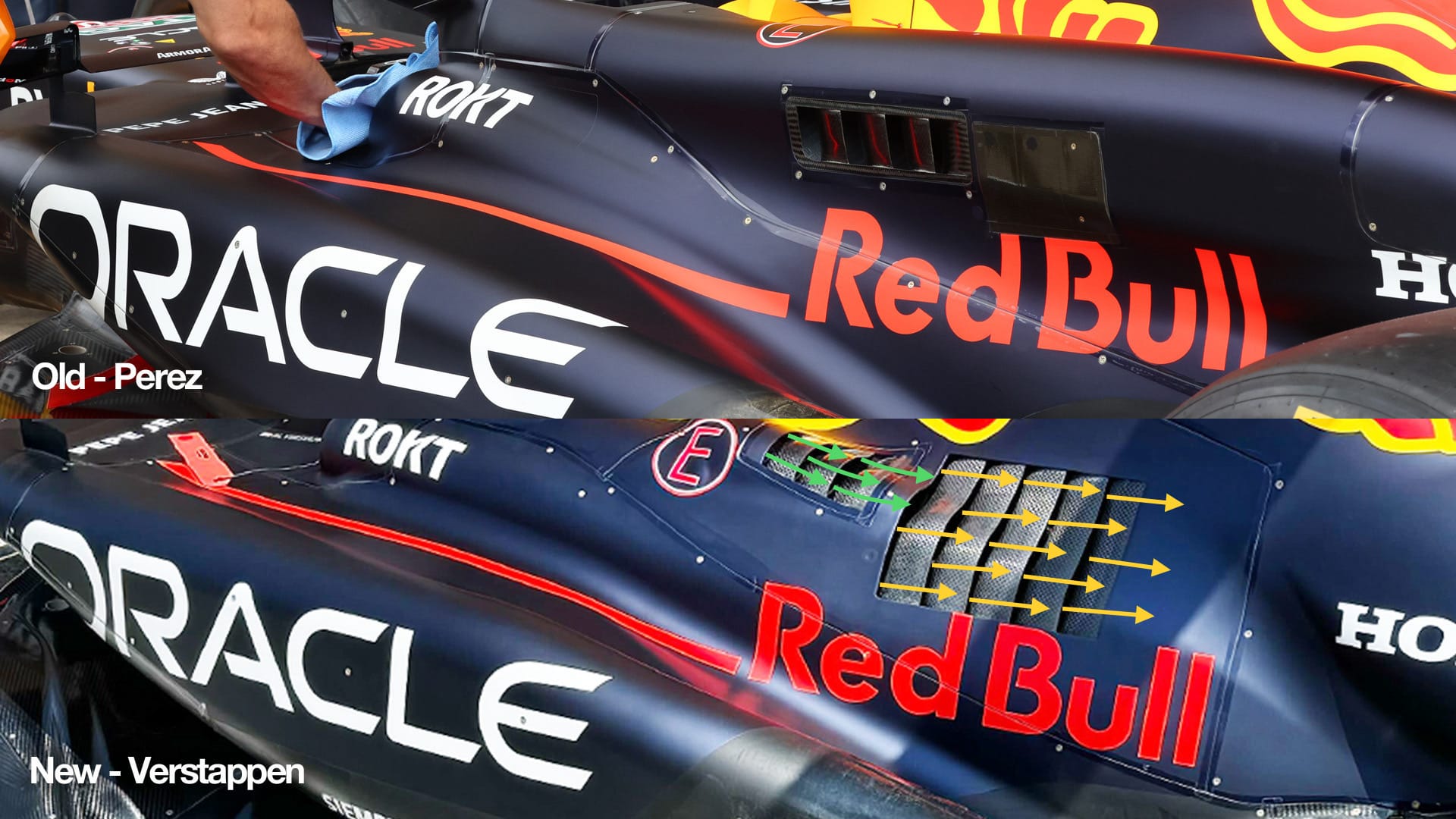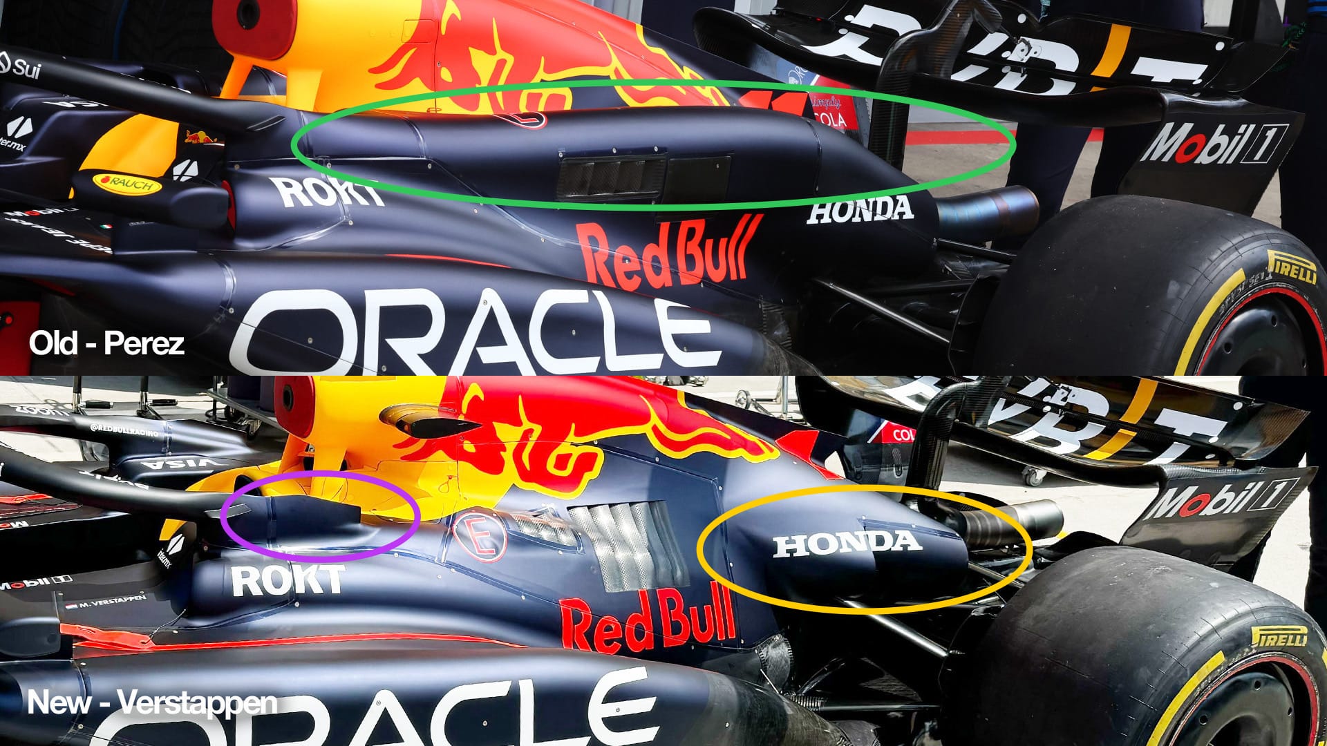 With that bodywork change, the louvre exits (green and yellow arrows on the image below) are now more compact on that new body surface. They are also bigger, so - as Red Bull has explained - this reduces the losses in flow velocity near the rear of the car, which would have negatively affected the performance of the rear wing.