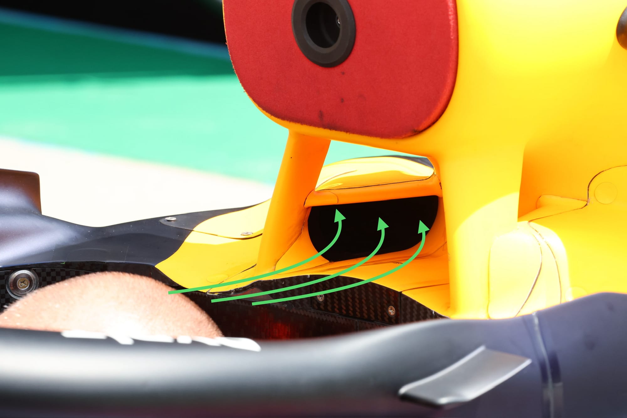 As part of these changes, the cooling intake behind the driver’s head has also been modified. Previously, this faced forward but in line with all the other changes in that upper cooling geometry, Red Bull now has an internal opening at 90 degrees to the car centreline, just above the chassis section supporting the headrest.