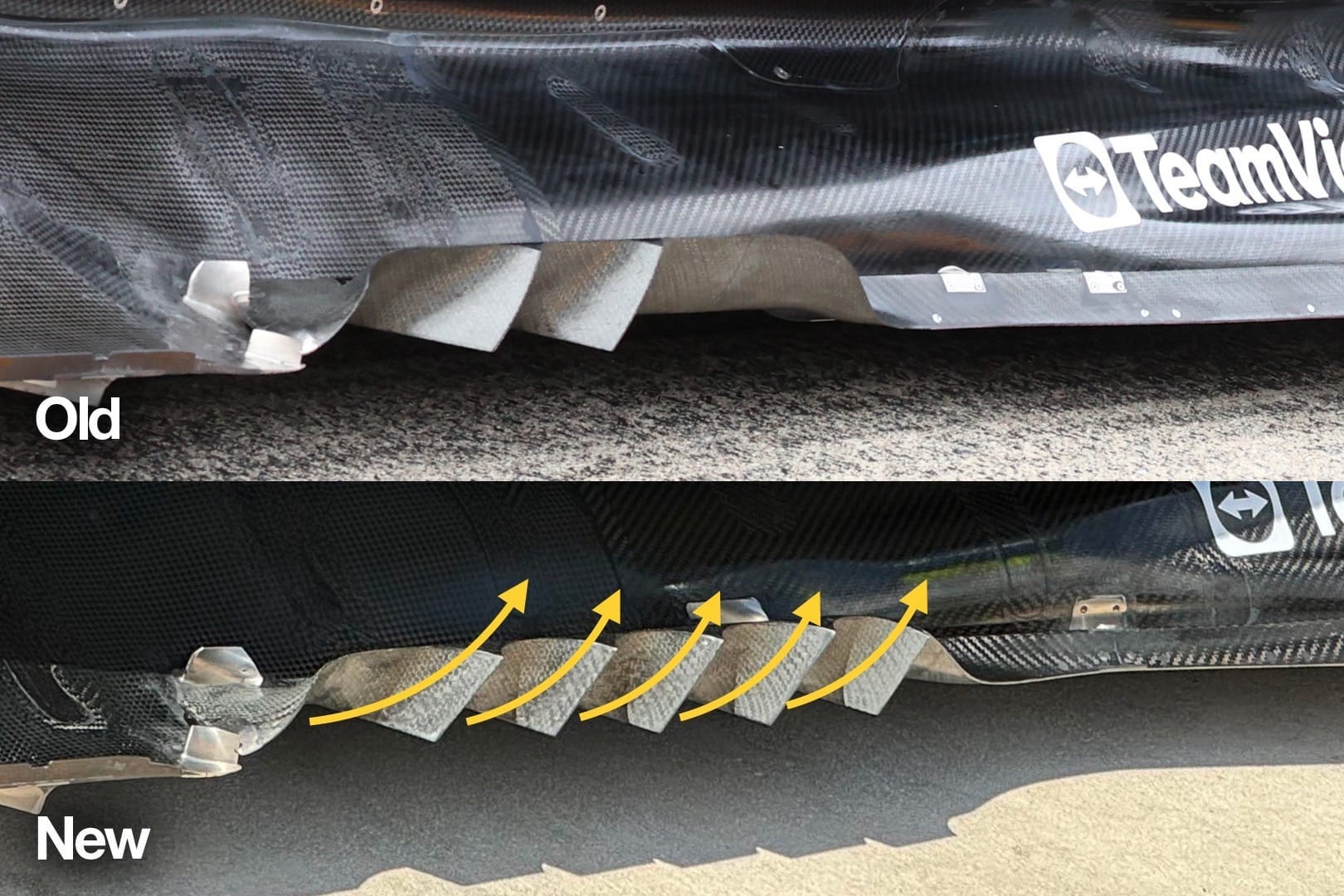 The outer edge of the forward section of the underfloor is the other area of development. This seems based on the old axiom of ‘if two are good then five should be better’. The position of these turning vanes and how they work with the splitters in the leading edge of the underfloor is critical to its overall performance.