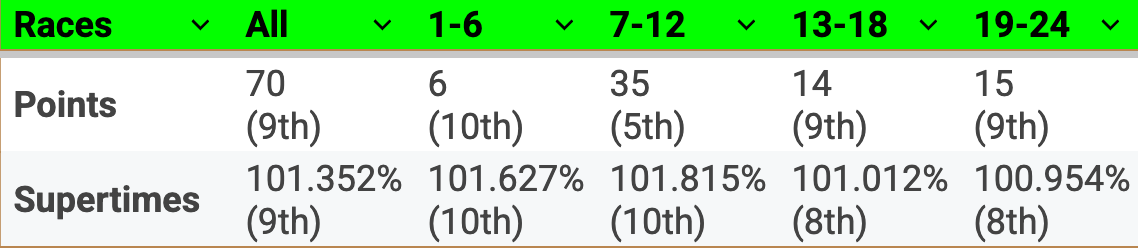 This includes driver points and team and driver supertimes - the fastest lap set on a weekend expressed as a percentage of the fastest time overall, so the closer a driver or team is to 100%, the quicker they are.