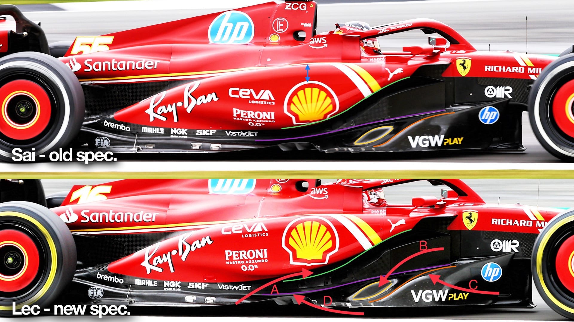 A is the underneath of the sidepod being raised up to increase the gap to the upper floor surface. This will reduce the flow velocity through this section of the body profile. It will also move the focus of this flow velocity rearwards reducing its influence on the floor side exit vanes. This height change can also be seen with the positioning of the Shell decal.