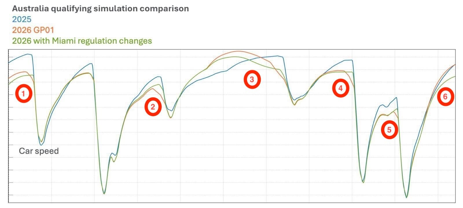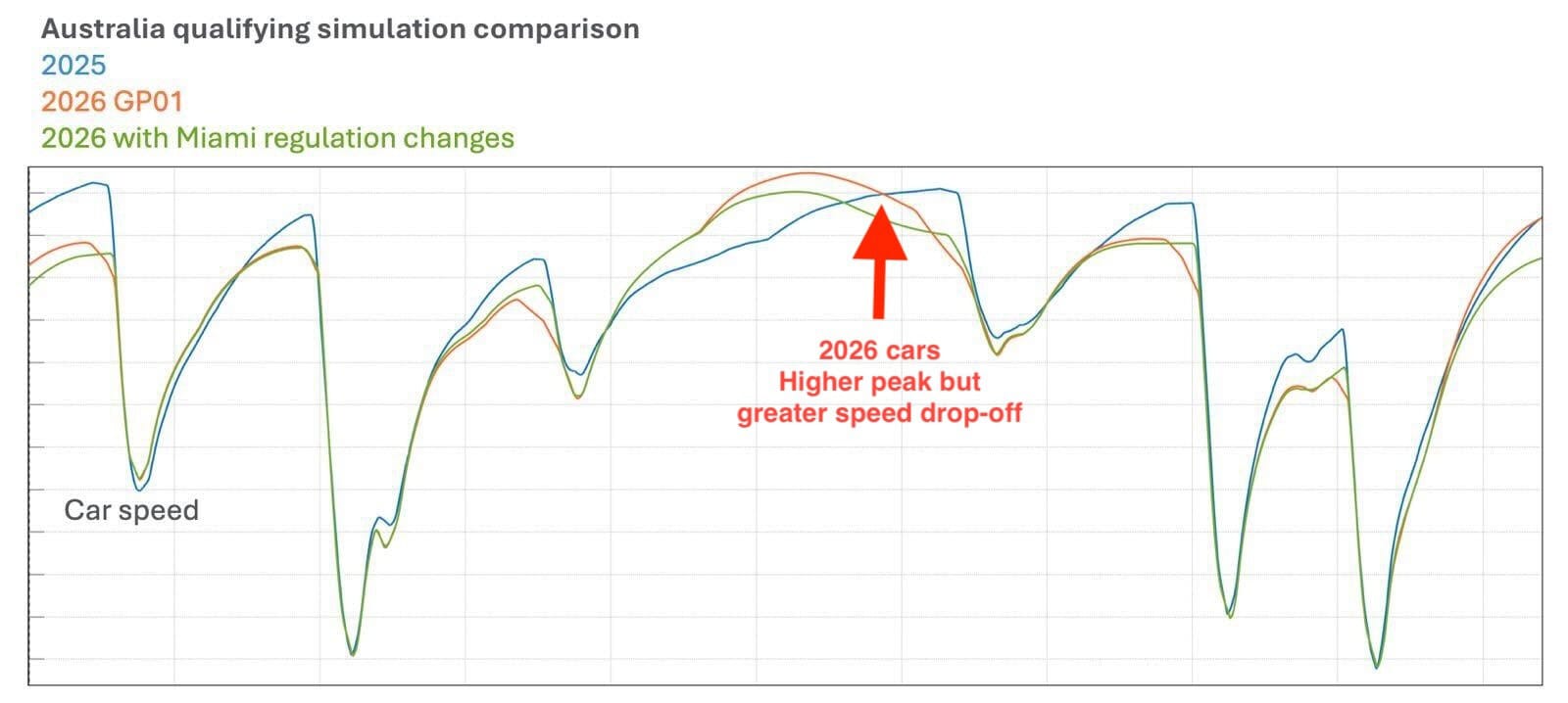 Led by technical director for engineering Mark Temple, McLaren has produced a combination of speed traces comparing a 2025 lap, the 2026 car as it actually ran in Australia, and a 2026 car running to the new Miami-onwards rules.