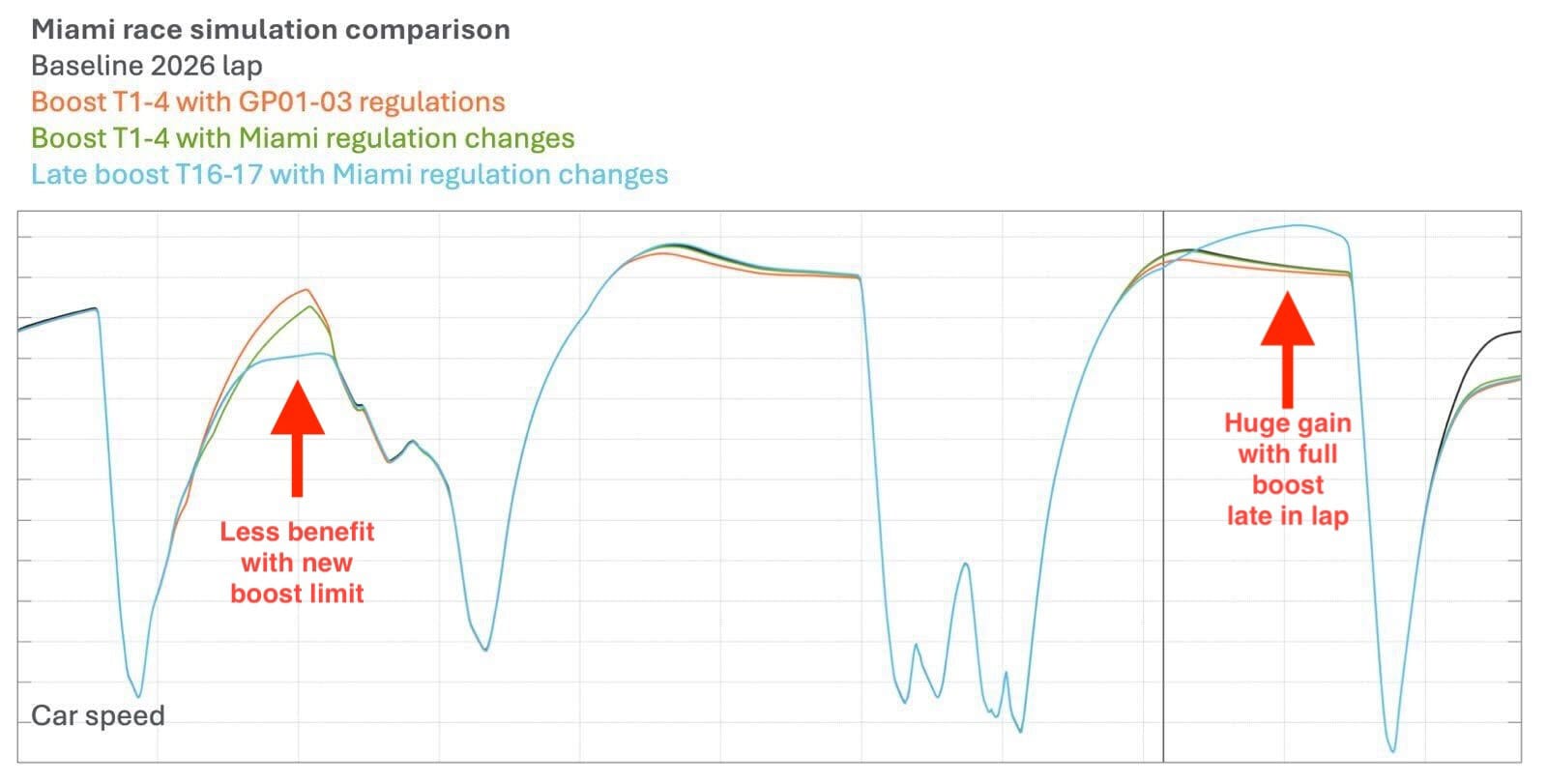 McLaren produced the example of how the different boost limits impact how you would benefit from deploying your energy differently in Miami.
