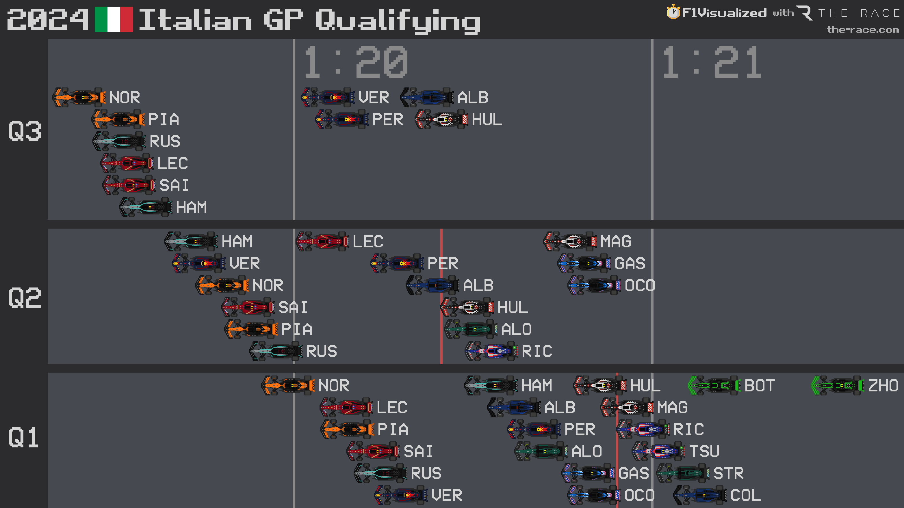 Verstappen's next lap wasn't much better as he only rose to seventh place, edging ahead of Perez by 0.040 seconds. Perez couldn't beat him as he kicked up a heap of gravel at the exit of Lesmo 2 which Verstappen had to drive through.