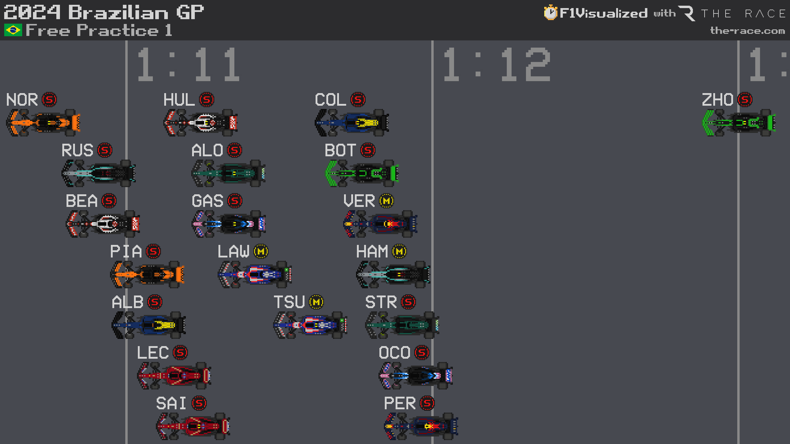 McLaren set the pace initially, with Piastri into the low 1m13s and Norris straight into the 1m12s before both cars disappeared into the garage for a long spell, apparently having the suspension adjusted for this newly resurfaced but somehow bumpier Interlagos F1 track.