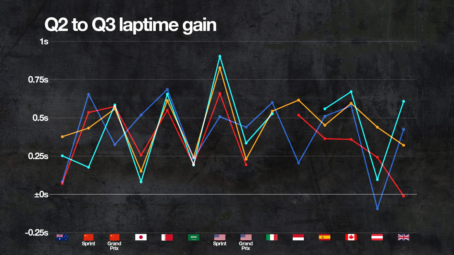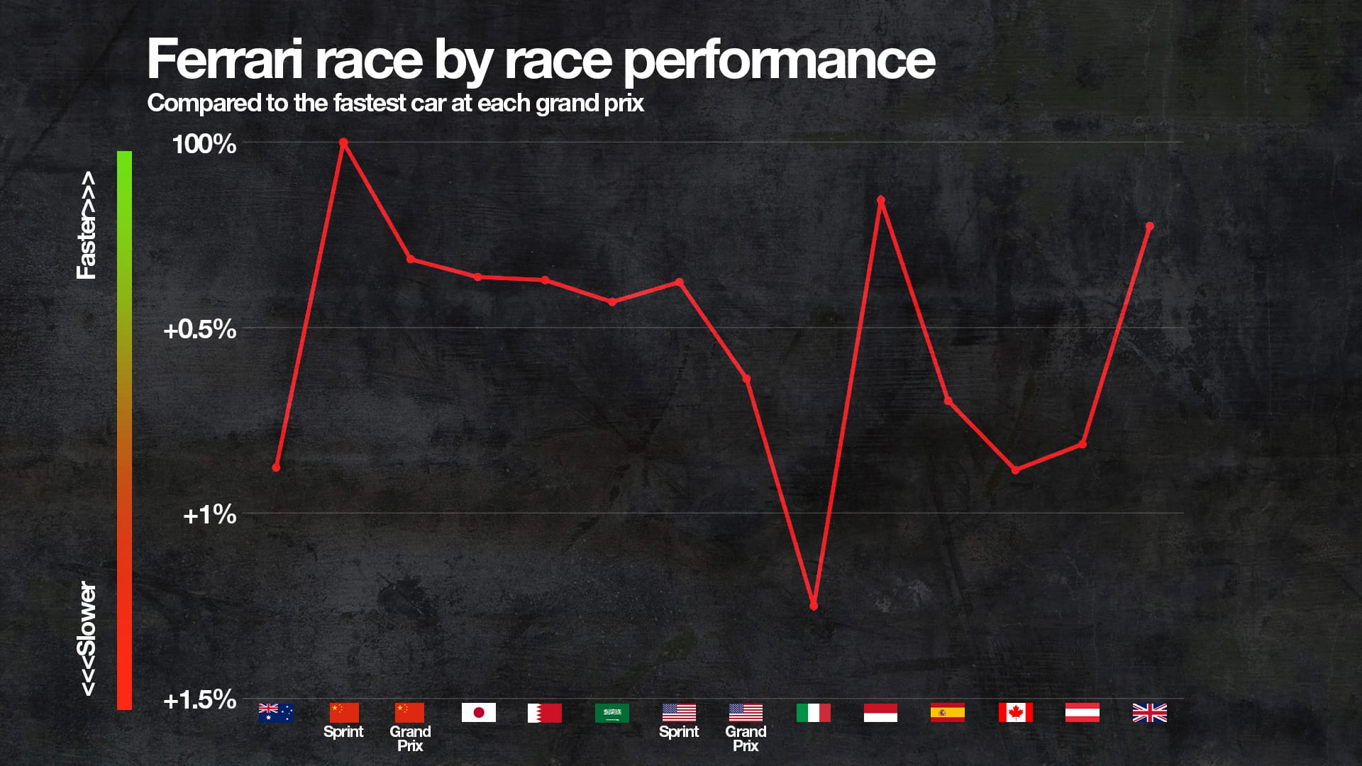 In the 14 qualifying sessions (including Sprint qualifying), Ferrari has not once found the most laptime of the four teams.