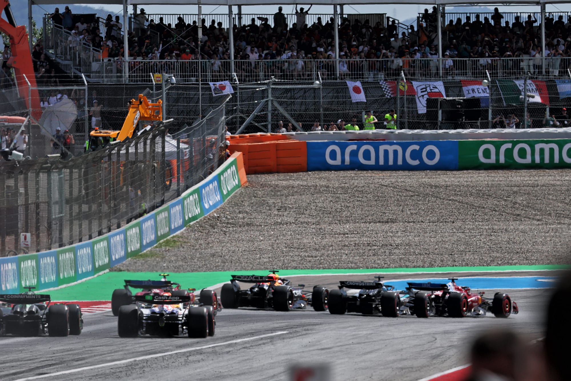 As the Ferrari steamed down the inside into Turn 1, George Russell dived in there too, Verstappen took to the run-off and rejoined still ahead of the Mercedes but behind the Ferrari.