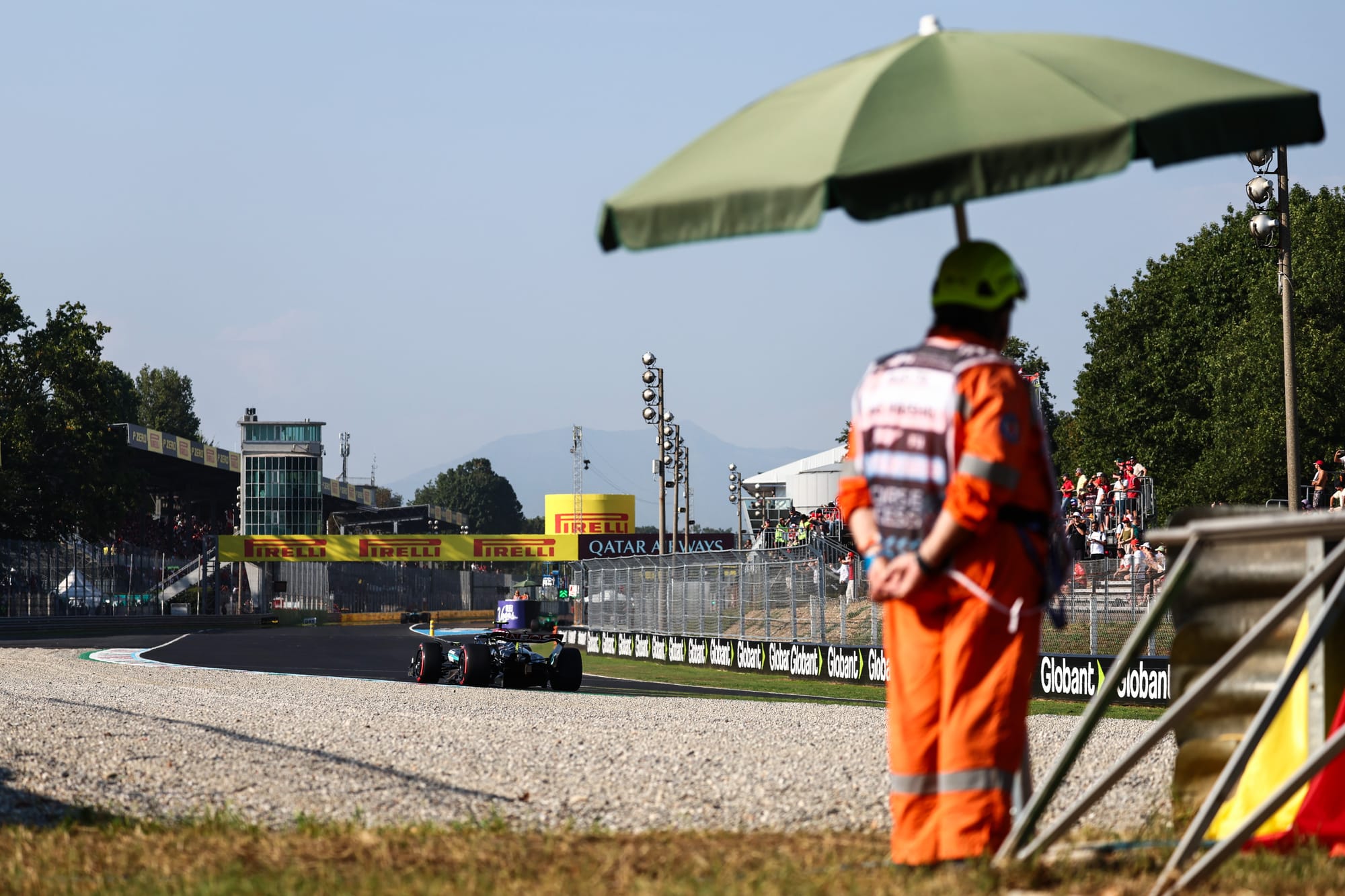 The rookie lacked nothing in commitment, the accident coming after he took too much speed into Parabolica, having just set the fastest middle sector time. Mercedes was running its two floors back-to-back, with Hamilton on the newer one for FP2, Russell the previous spec.