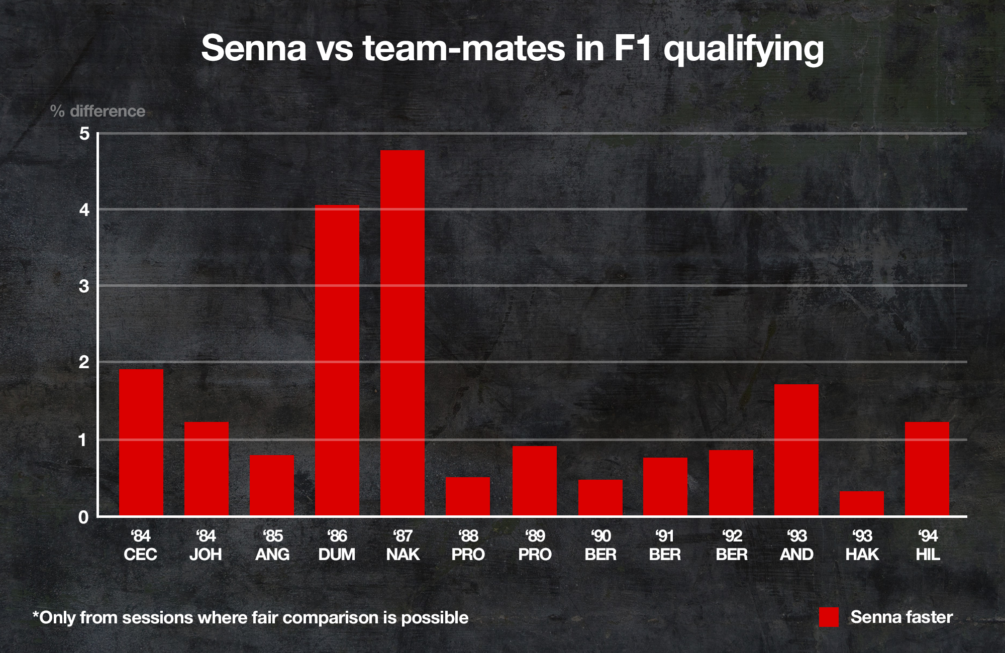Here are the qualifying match ups with team-mates of seven of the great drivers of the last few decades: Ayrton Senna, Michael Schumacher, Fernando Alonso, Lewis Hamilton, Sebastian Vettel, Max Verstappen and Charles Leclerc.