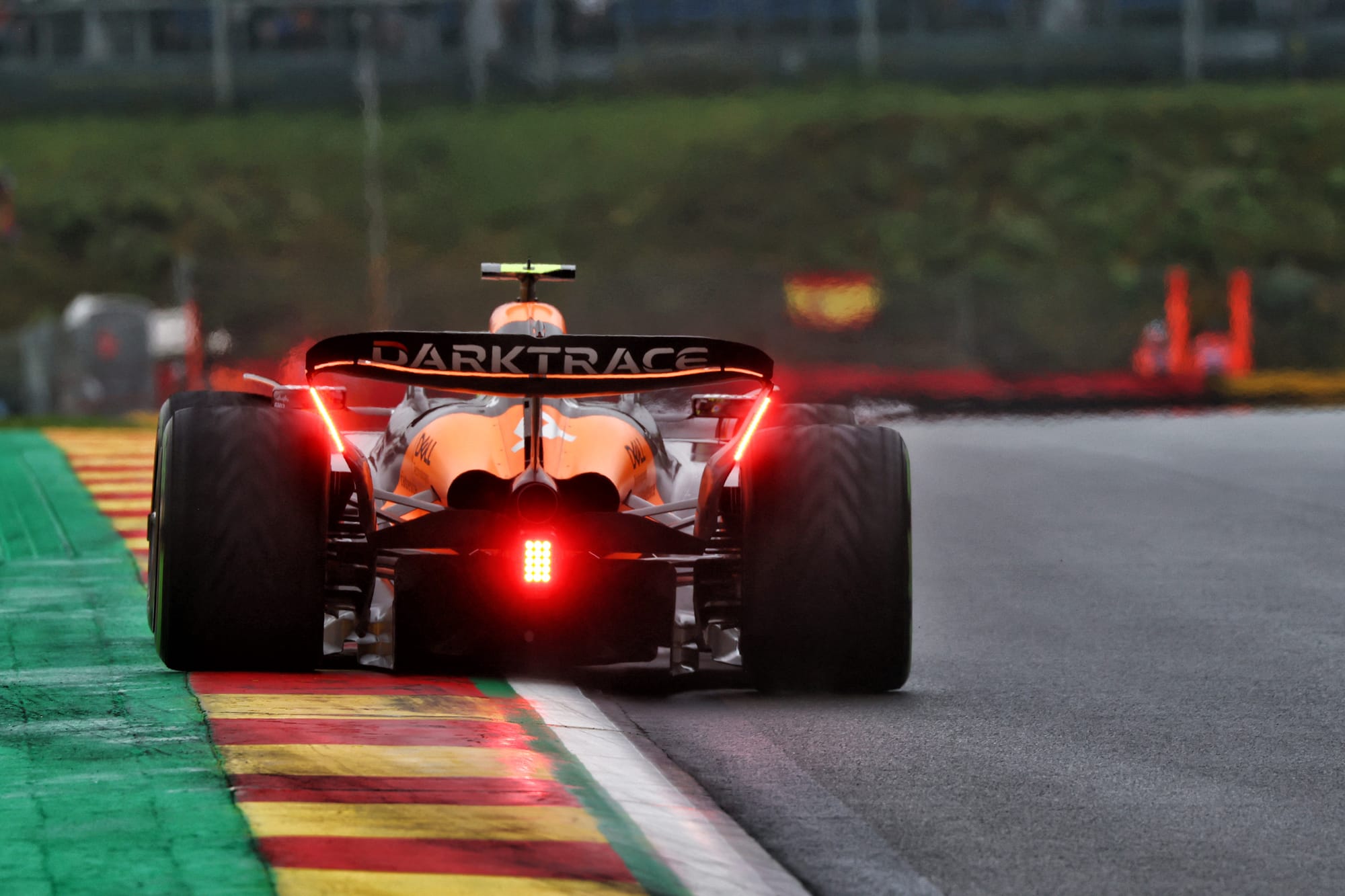 There’s a very good reason the McLarens qualified only fifth and sixth in the wet. They ran significantly less downforce than the others, especially Red Bull. But race day is forecast to be dry. So McLaren ran the smaller wing it’s had all weekend and just continued with the greater angle it ran in FP2, just enough to keep it in its efficiency range.