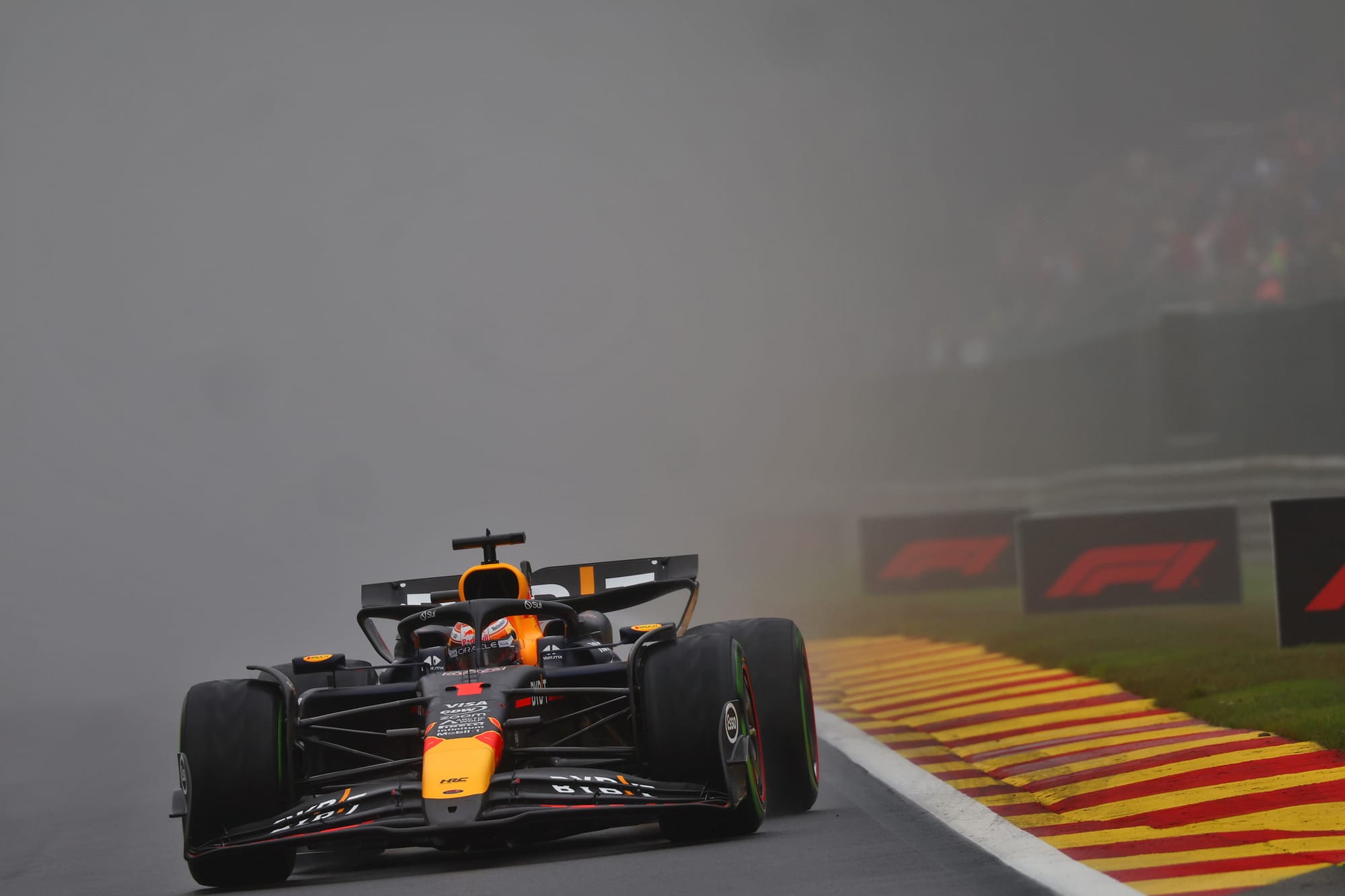 A high-downforce level wing is generally faster over a single lap of Spa in the dry and obviously even more so in the wet. But in the dry, obviously it potentially makes the car less raceable, makes it difficult to attack or defend on the long runs to the overtaking spots of Les Combes and the Bus Stop. Maybe. Verstappen doesn’t see it like that. He’s seeing it from a tyre deg perspective.