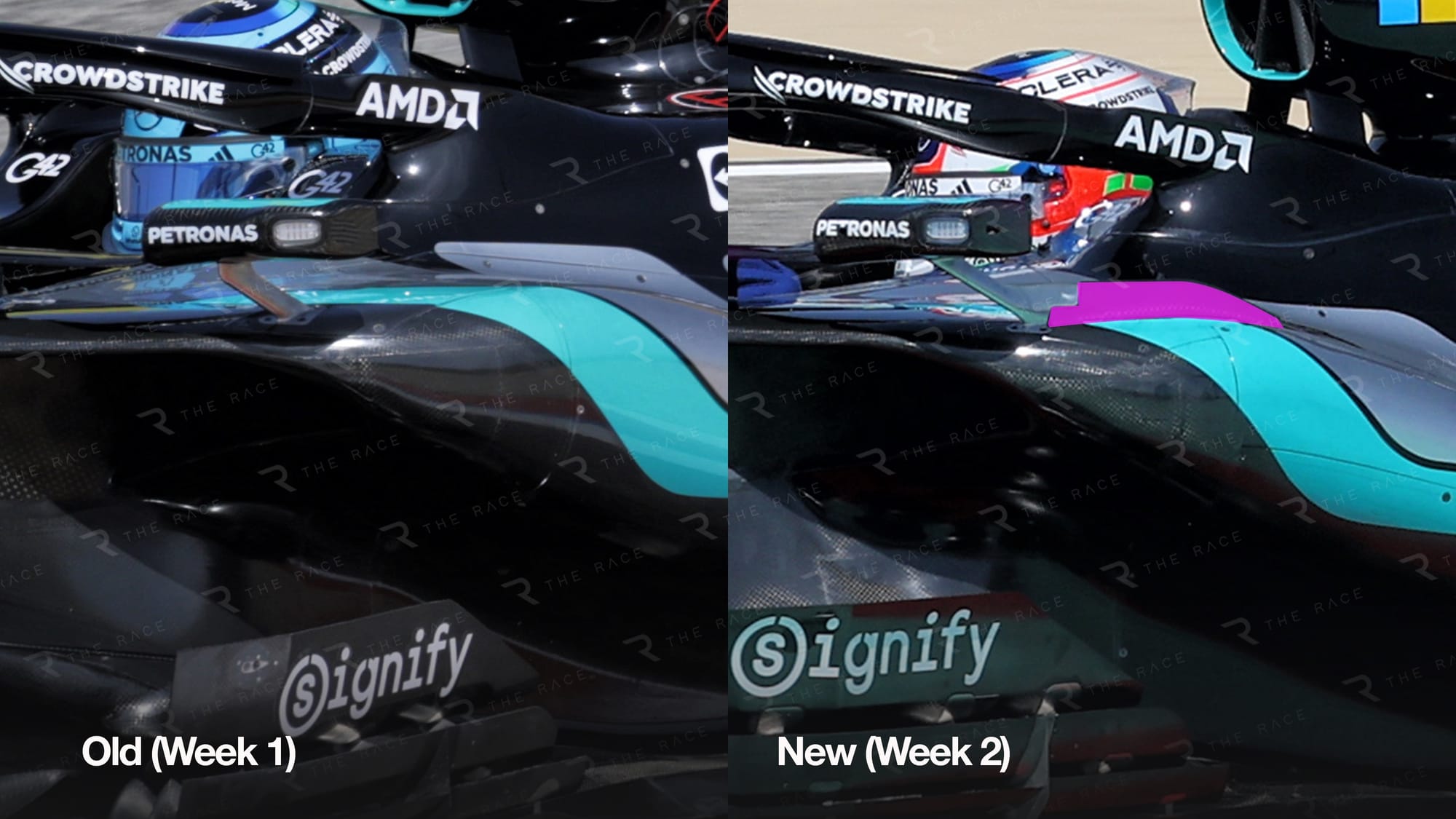 Mercedes has brought a number of changes to its W17 in Bahrain for this week, including a revised sidepod shape that’s more compact at the rear end.
