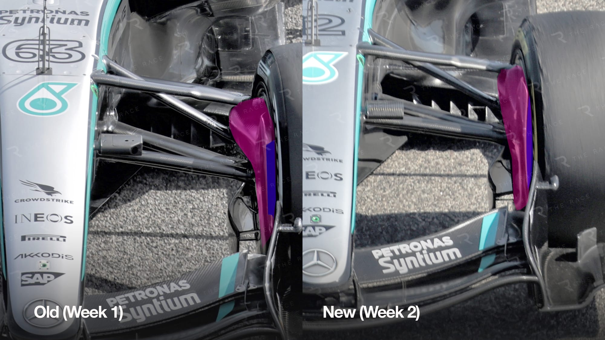 It has revised brake ducts at the front of the car, as well as a new front wing endplate that incorporates the trend of horizontal vanes seen across various teams, including McLaren.