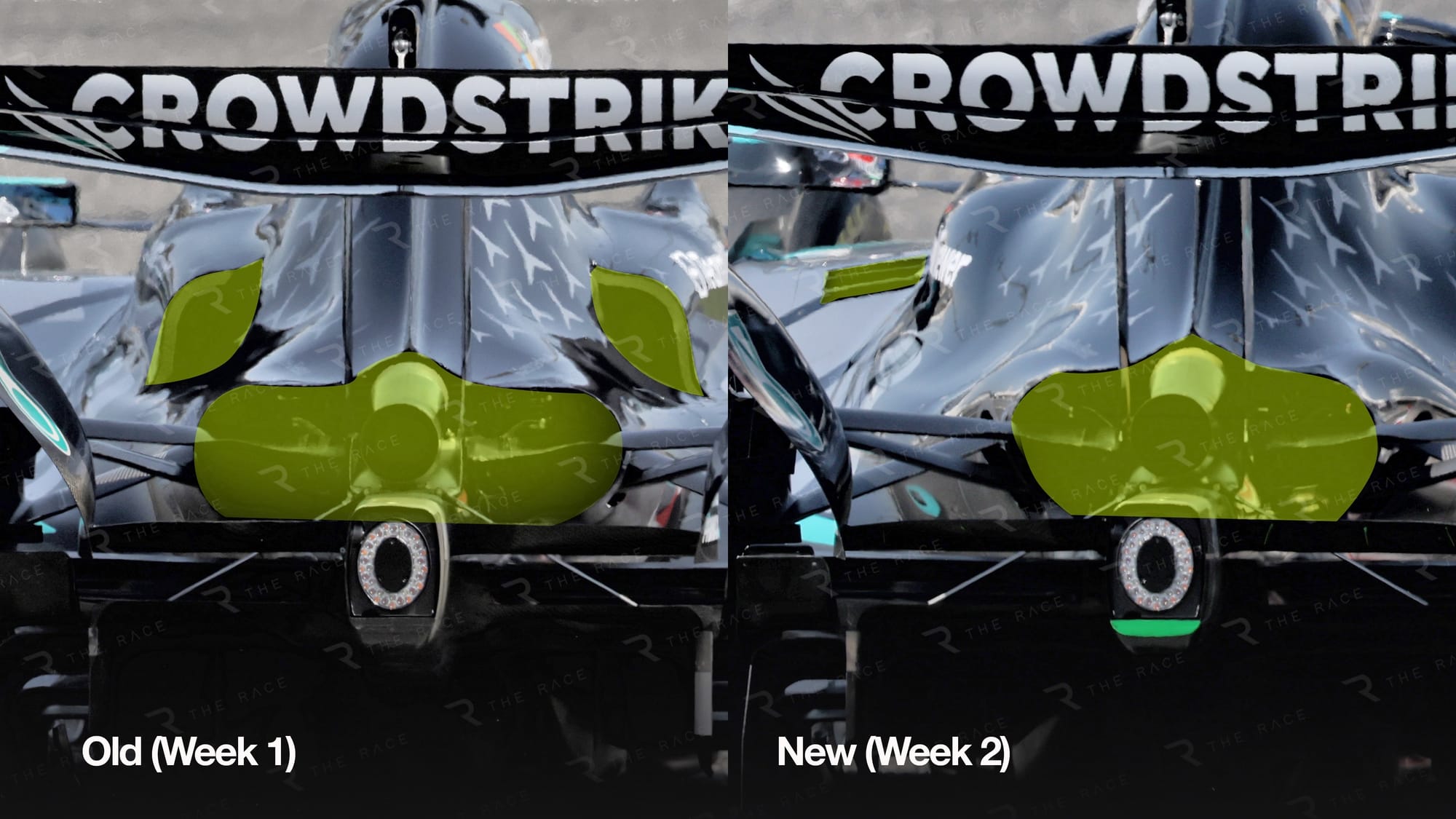 At the rear of the car, there’s a slightly revised engine cover that houses the exhaust, and revised cooling gills on the top of the sidepods.