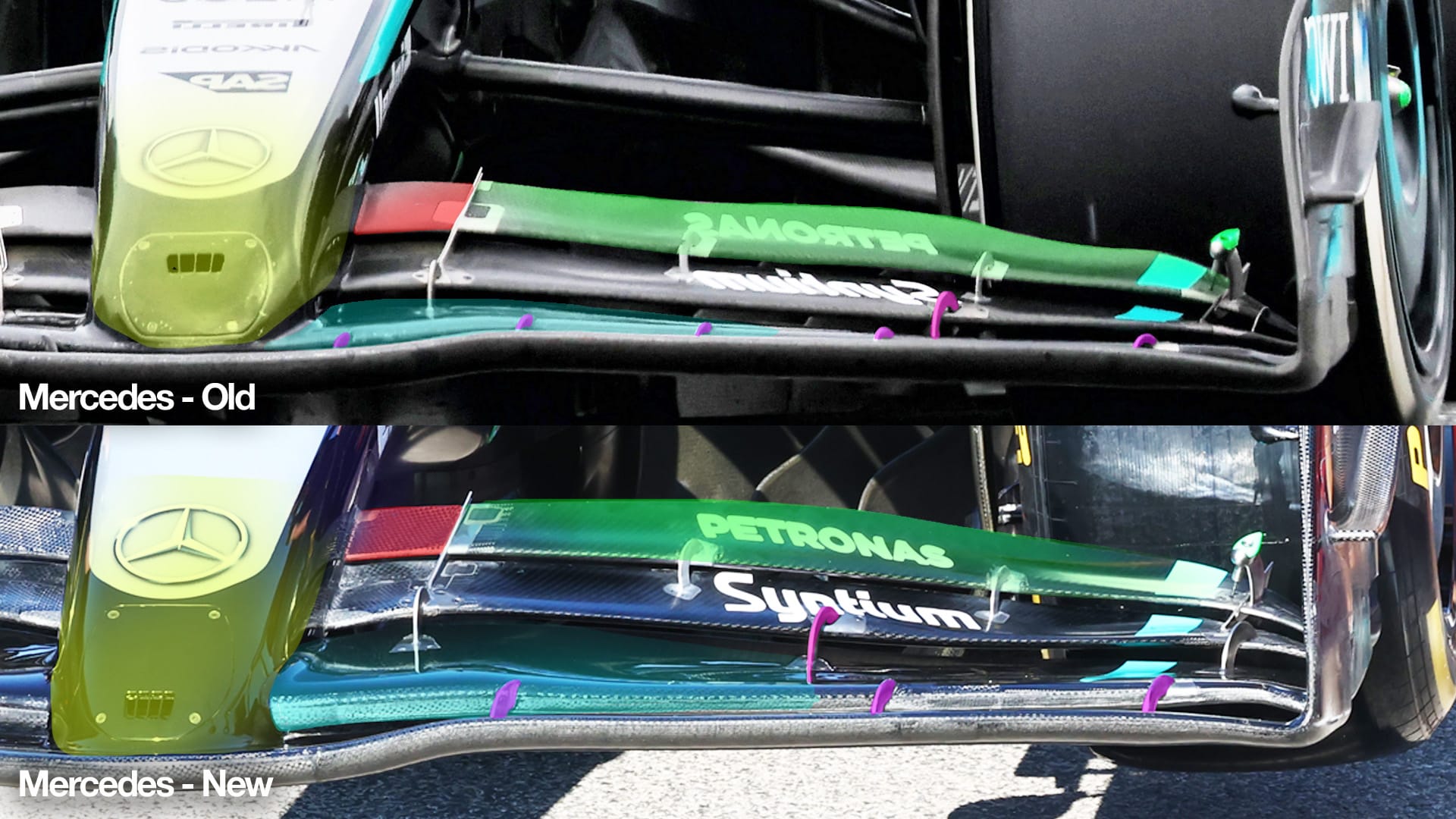 One other interesting aspect of Mercedes' Imola upgrade was the front wing design, which featured a different arrangement of the flap connectors.
