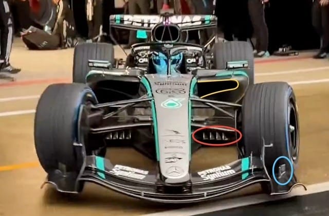 The underfloor leading edge splitters (red ellipse above) are much smaller than last year. That is because of the reduced underfloor ground effect, meaning that the leading edge of the floor is lower. They will still be more or less working in the same way by turning some of that airflow outwards, but just less effective.